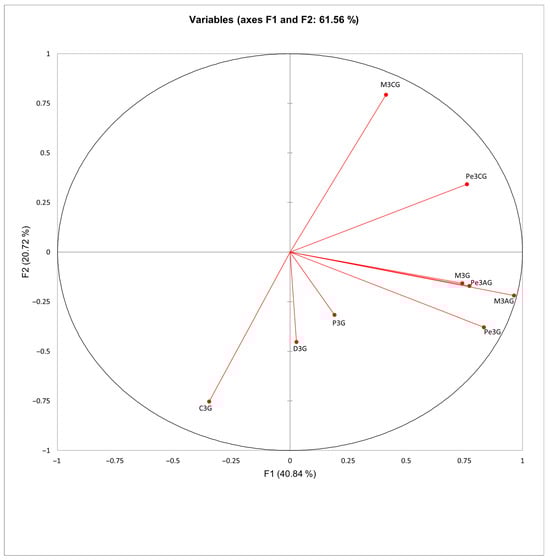 The principal component analysis (PCA) biplots provide a two-dimensional visualization of the relationships between anthocyanin compounds and fatty acid profiles in the analyzed red grape cultivars (Figure 3 and Figure 4). The first two components explain 61.56% of the variance for anthocyanin compounds (F1 = 40.84%, F2 = 20.72%) and 94.08% for fatty acids (F1 = 86.87%, F2 = 7.21%). Malvidin- and peonidin-derived glycosides including malvidin-3-O-glucoside (M3G), peonidin-3-O-acetylglucoside (Pe3AG), malvidin-3-O-acetylglucoside (M3AG) and peonidin-3-O-glucoside (Pe3G) cluster together, indicating that these compounds are the primary drivers of variation in anthocyanin profiles across cultivars. In contrast, certain monoglucoside anthocyanins, such as cyanidin-3-O-glucoside (C3G), delphinidin-3-O-glucoside (D3G), and petunidin-3-O-glucoside (P3G), are distinctly separated from acylated anthocyanins, suggesting differences in their chemical structures. These structural variations may influence various properties, including stability, antioxidant potential, and bioaccessibility, potentially enhancing or reducing their effectiveness.