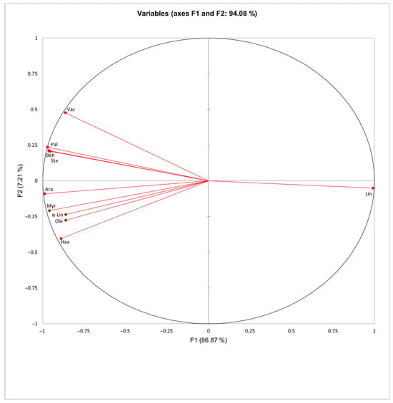Principal component analysis (PCA) of lipid composition in red grape (Vitis vinifera L.) cultivars. Myr, myristic; Pal, palmitic; Hex, cis-7-hexadecenoic; Ste, stearic; Ole, oleic; Vac, vaccenic; Lin, linoleic; α-Lin, α-linolenic; Ara, arachidic; Beh, behenic acid.