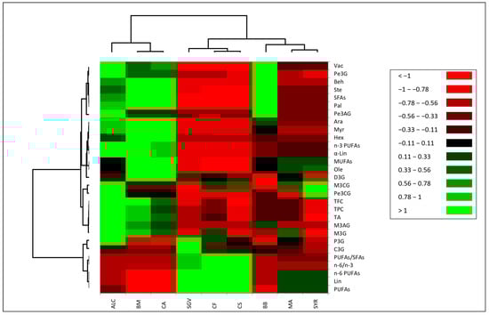 Heatmap visualization: Biochemical profile of analyzed red grape (V. vinifera L.) cultivars. The heatmap shows correlation coefficients, with red tones indicating negative correlations and green tones positive correlations. The color intensity reflects the correlation strength (scale from −1 to +1). D3G, delphinidin-3-O-glucoside; C3G, cyanidin-3-O-glucoside; P3G, petunidin-3-O-glucoside; Pe3G, peonidin-3-O-glucoside; M3G, malvidin-3-O-glucoside; Pe3AG, peonidin-3-O-acetylglucoside; M3AG, malvidin-3-O-acetylglucoside; Pe3CG, peonidin-3-O-p-coumaroylglucoside; M3CG, malvidin-3-O-p-coumaroylglucoside; Myr, myristic; Pal, palmitic; Hex, cis-7-hexadecenoic; Ste, stearic; Ole, oleic; Vac, vaccenic; Lin, linoleic; α-Lin, α-linolenic; Ara, arachidic; Beh, behenic acid; SFAs, saturated fatty acids; MUFAs, monosaturated fatty acids; n-3 PUFAs, omega-3 polyunsaturated fatty acids; n-6 PUFAs, omega-6 polyunsaturated fatty acids; n-6/n-3, ratio of omega-6 to omega-3 fatty acids; PUFAs/SFAs, ratio of polyunsaturated to saturated fatty acids. ALC, Alicante Bouschet; BM, Burgund Mare; CA, Cadarcă; SGV, Sangiovese; CF, Cabernet Franc; CS, Cabernet Sauvignon; BB, Busuioacă de Bohotin; MA, Malbec; SYR, Syrah.