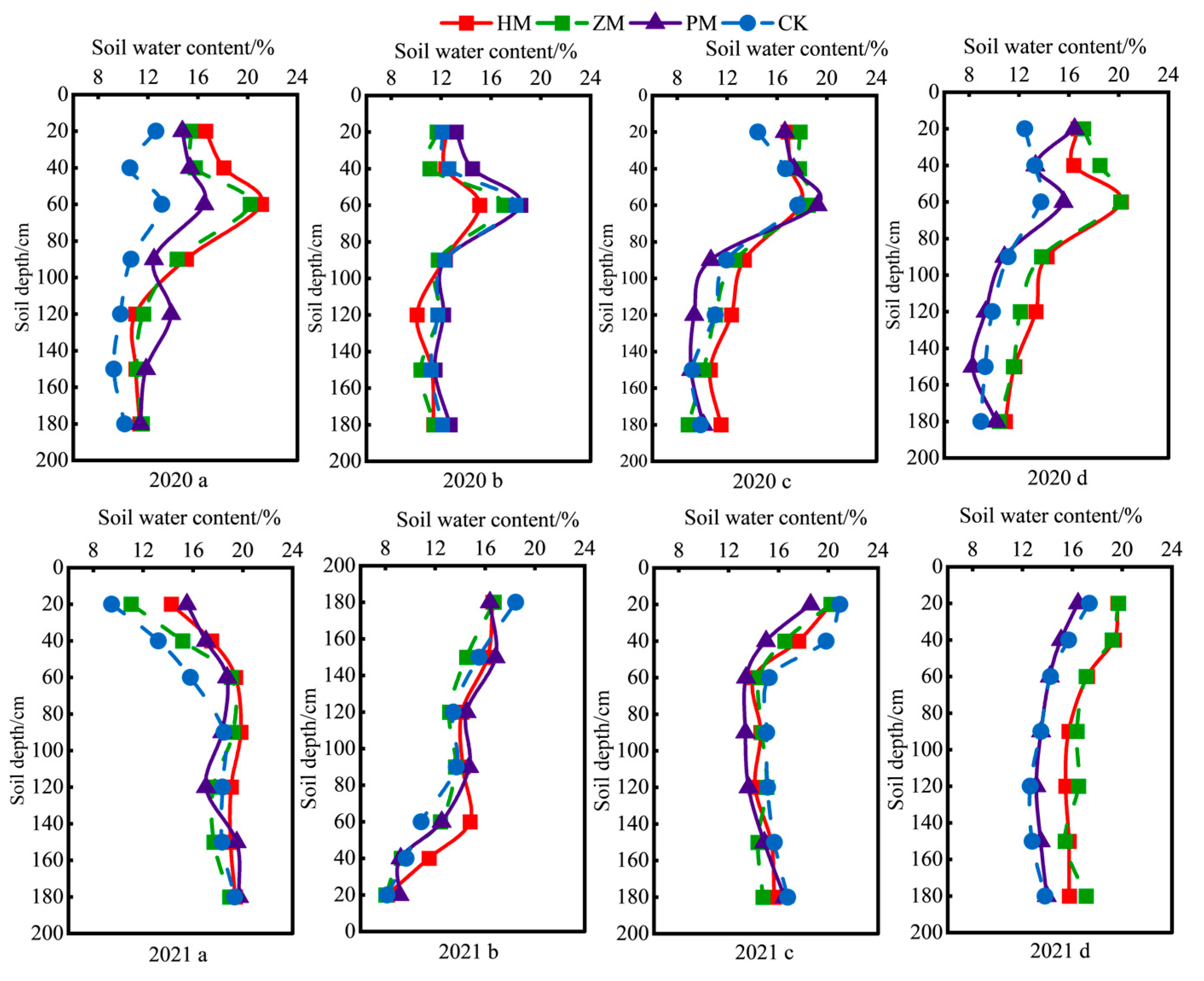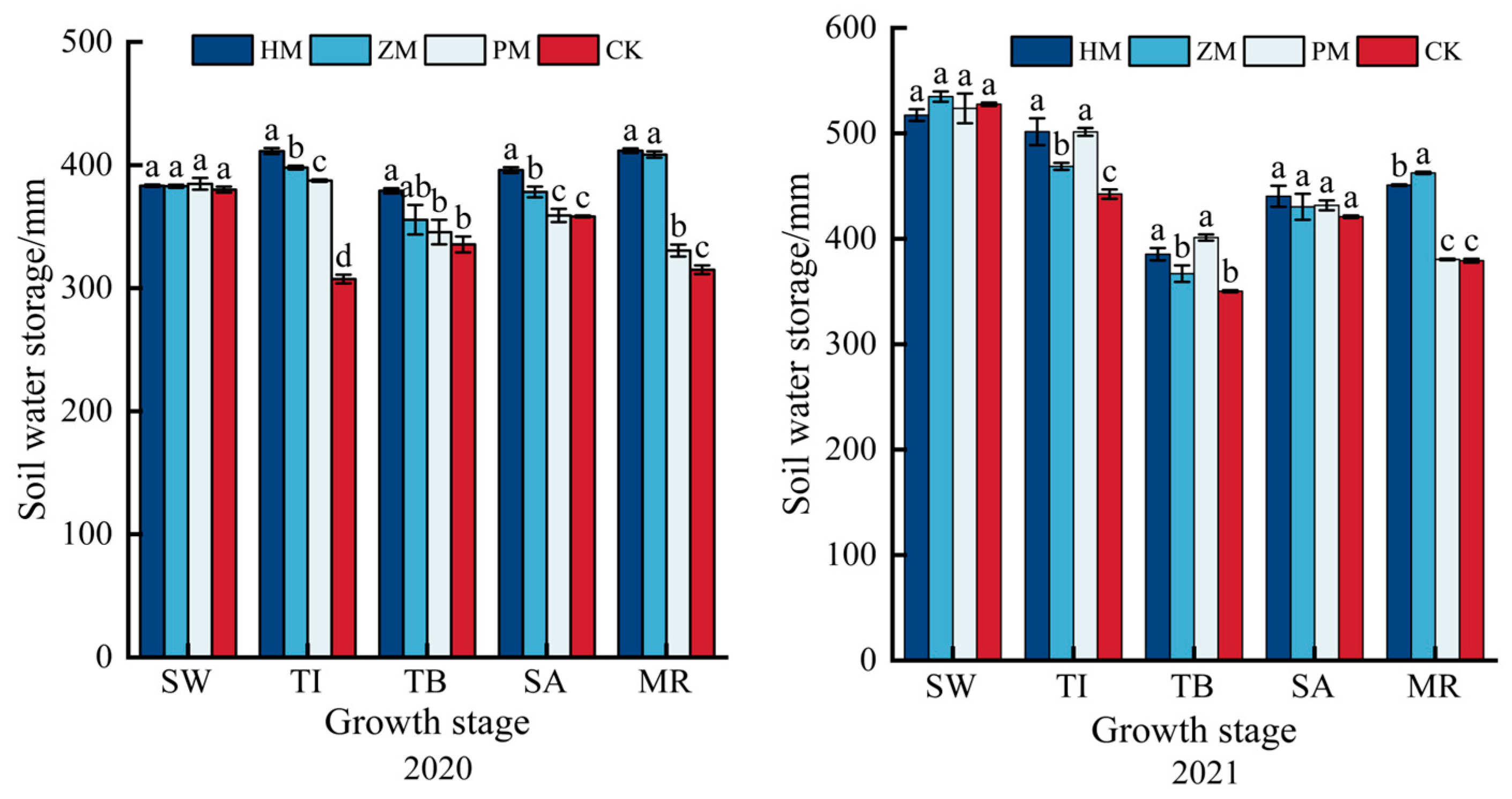 4.1. Effect of Furrow Cover Planting Method on Soil Water Storage