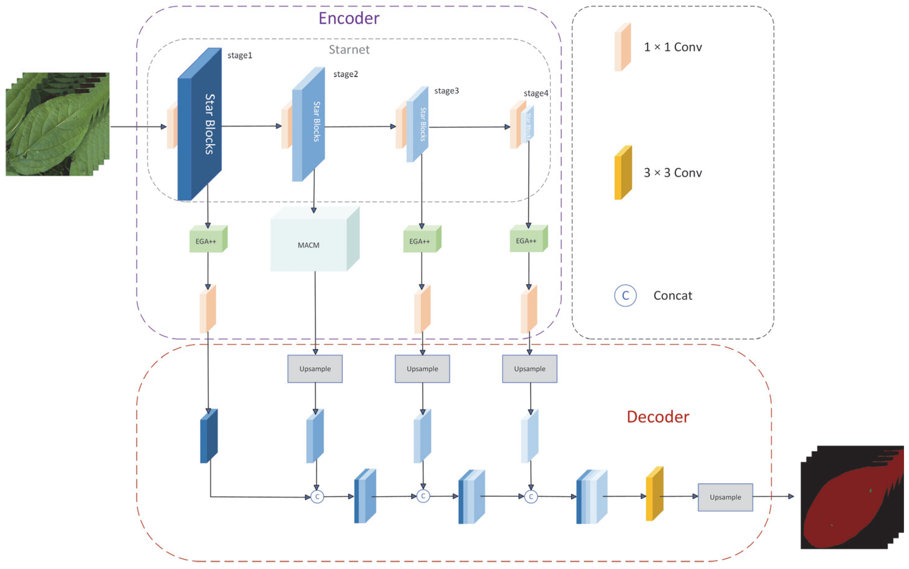 0.1%, respectively, the best values in all experimental configurations. The parameter count further decreases to 2.524 M, and GFLOPs drop to 36.857, reducing computational overhead by approximately 31% compared to the configuration with only the GECF module. This highlights that the MACM module not only enhances multi-scale disease spot feature capture but also optimizes structure to significantly lower computational costs, making it a crucial component for practical deployment. The ablation study results show that each module independently contributes to the overall performance. StarNet improves computational efficiency, GECF enhances boundary detection, and MACM boosts multi-scale contextual reasoning. Removing any module significantly decreases mIoU, highlighting their complementary roles in the network structure. Statistical analysis indicates that each module makes an independent contribution to the overall performance, and the standard deviation of the three independent experiments remains consistently small, with the standard deviation of all metrics being less than 0.3%. This demonstrates the robustness and reproducibility of the results.