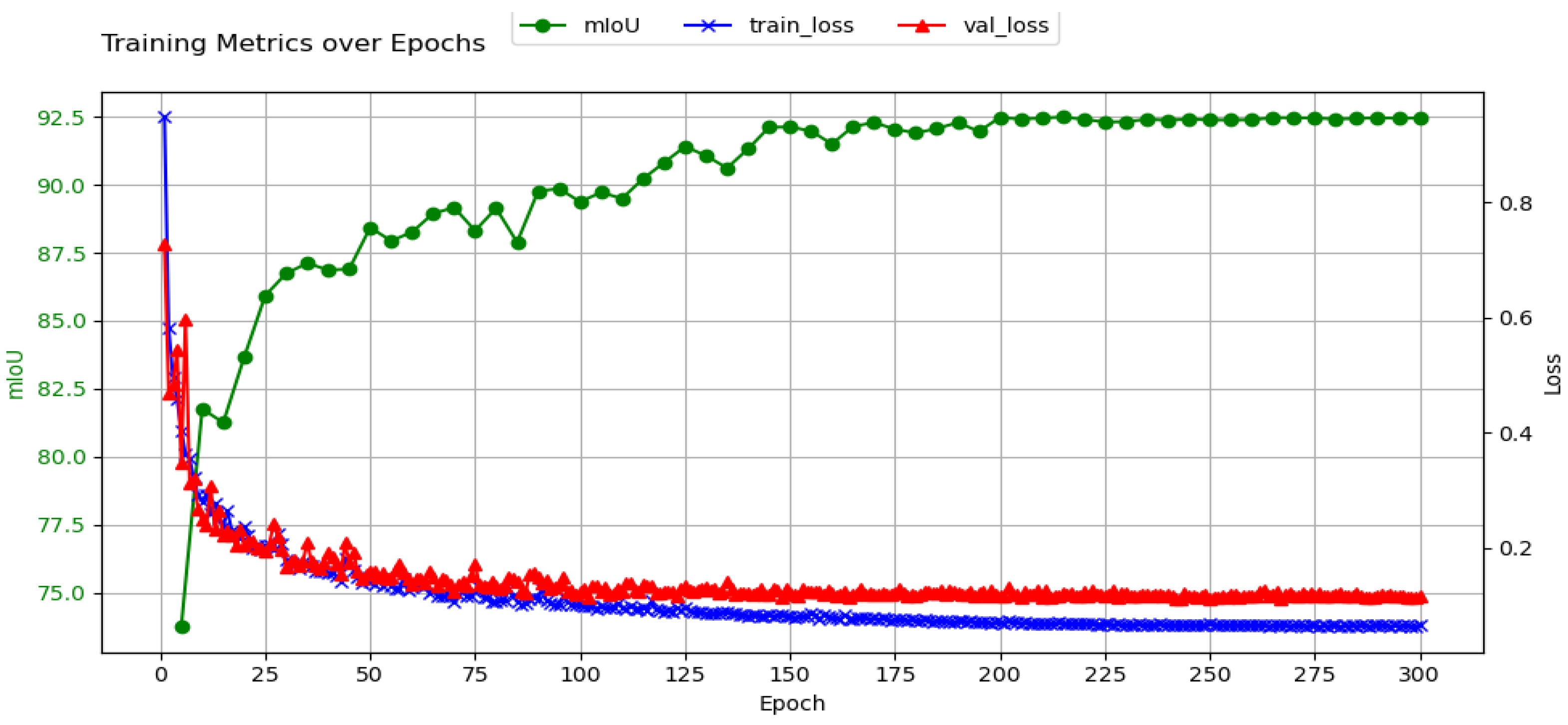 Figure 10, the training and validation performance of the LD-SAGE network are presented. The green line with solid circles represents the mIoU on the training set. The blue line with crosses and the red line with triangles represents the loss functions on the training and validation sets, respectively.