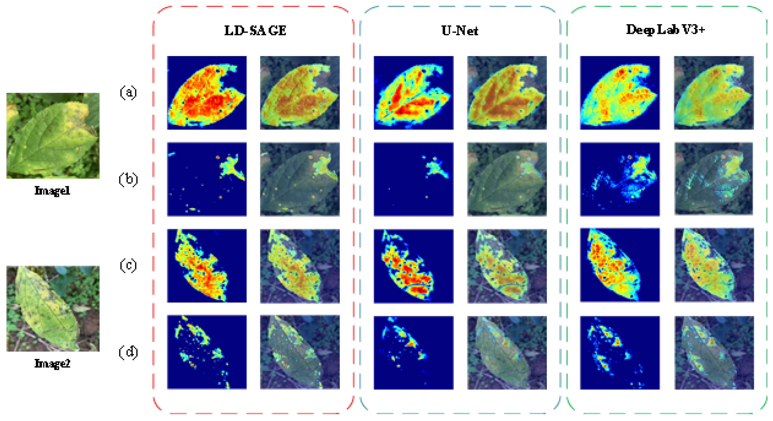 In disease detection, LD-SAGE not only responds strongly to large, high-contrast lesions but also detects small, subtle spots that are harder to distinguish, demonstrating its effectiveness in multi-scale feature fusion. Whether for large central lesions or smaller edge spots, the hotspot distribution aligns closely with the actual disease locations. In contrast, U-Net is less stable, with frequent breaks in the leaf edge, incomplete contours, and poor sensitivity to small lesions, leading to missed detections. U-Net’s heatmap often shows irregular background activations, indicating weak background suppression.