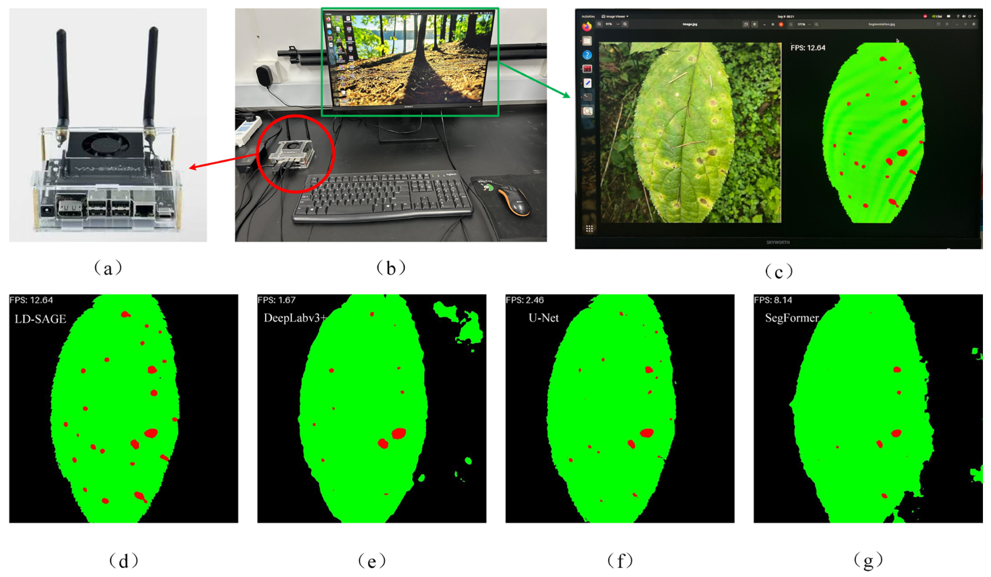 Figure 13g shows the segmentation result of the LD-SAGE model. The DeepLabv3+ model has poor segmentation accuracy, misclassifying the background as leaves, and the disease segmentation performance is inadequate. The U-Net model performs poorly in leaf disease segmentation and has a slow runtime of only 2.46 FPS, indicating its low real-time application efficiency on edge devices. The SegFormer model achieves a higher FPS of 8.14 compared to the other models, but its segmentation performance remains suboptimal, especially at the edges of leaves and in diseased areas, leading to mis-segmentation of parts of the background. In contrast, the LD-SAGE model proposed in this study demonstrates the best performance in both speed and segmentation accuracy on edge devices, highlighting its ability to operate stably on resource-constrained hardware platforms.