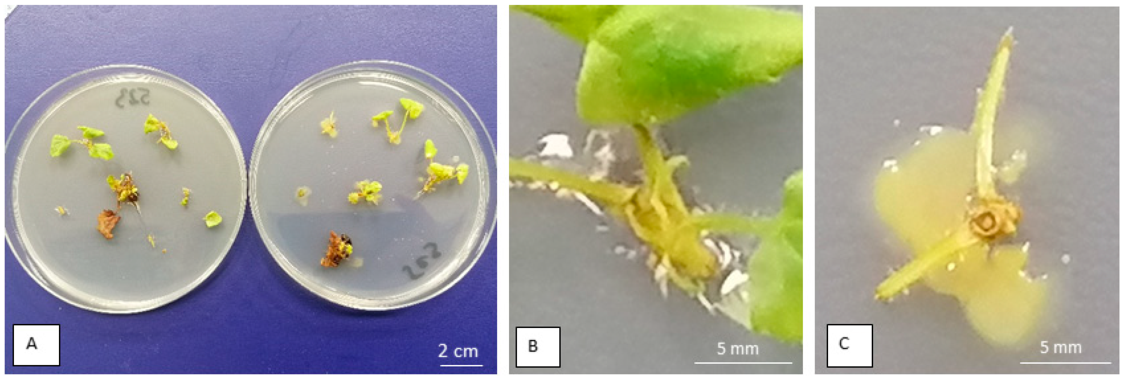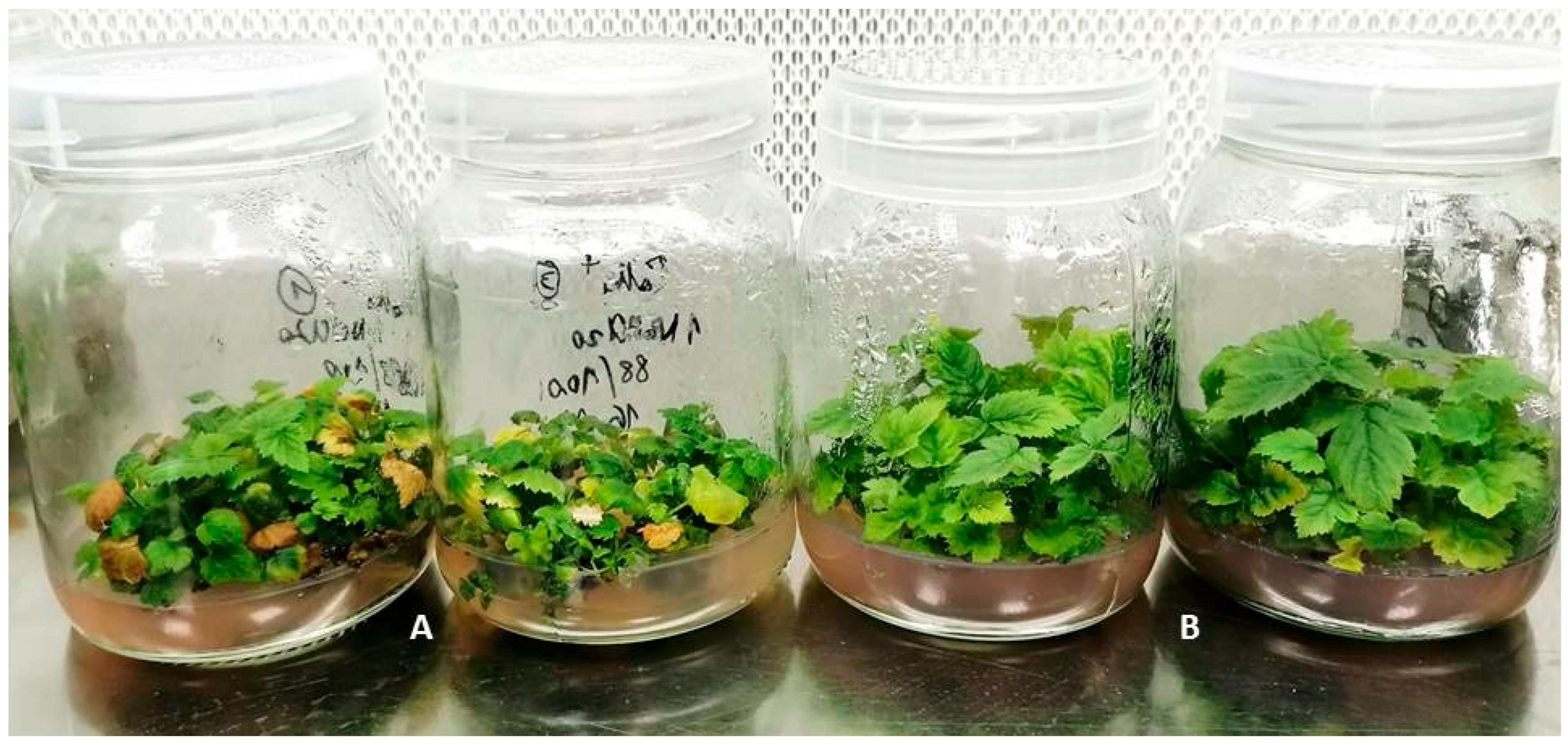 2.5. The Effect of Freeing Shoots from Bacteria on Shoot Multiplication, Rooting, and Surviving Storage Conditions