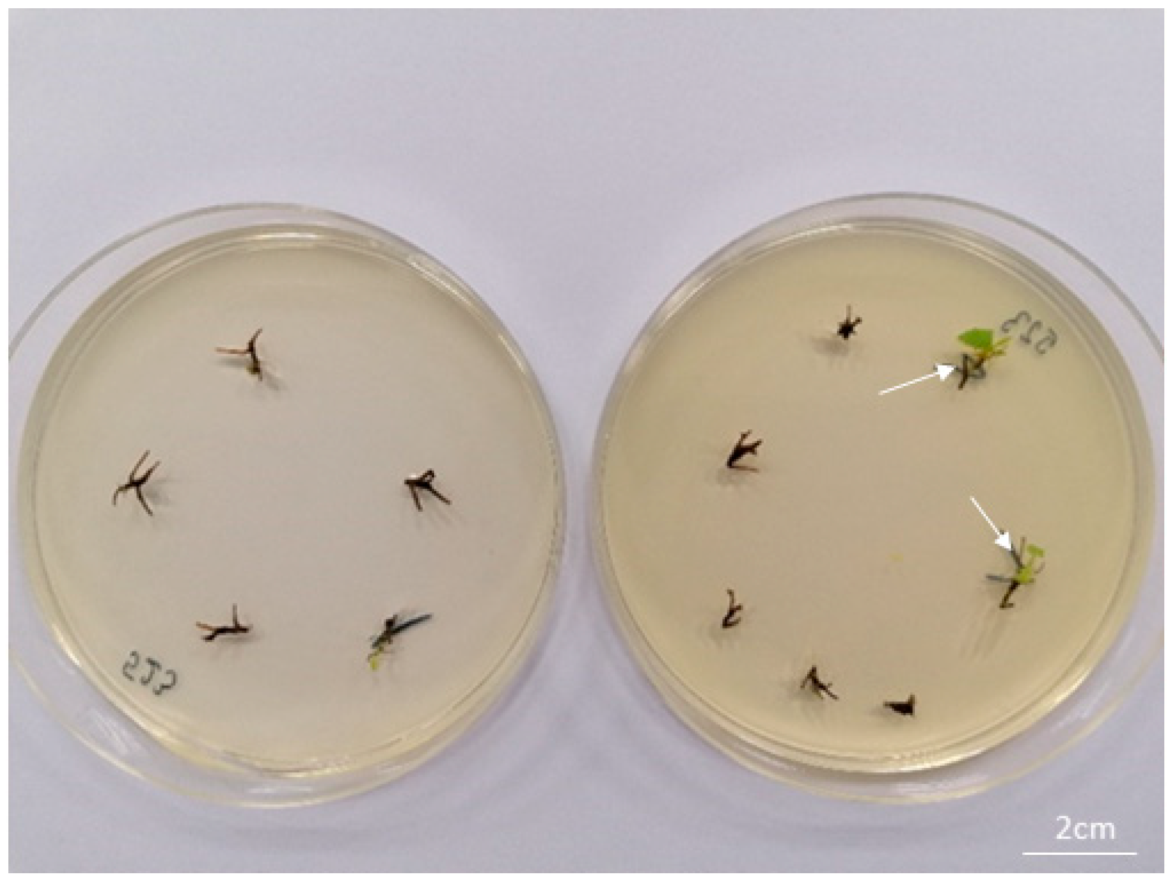 - Viss, P.R.; Brooks, E.M.; Driver, J.A. A simplified method for the control of bacterial contamination in woody plant tissue culture. In Vitro Cell. Dev. Biol. Plant 1991, 27, 42. [Google Scholar] [CrossRef]