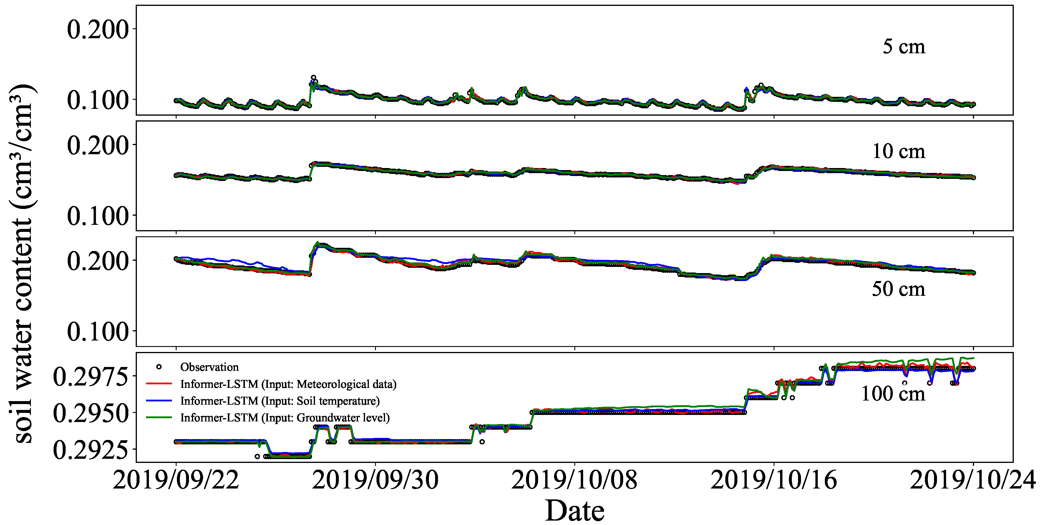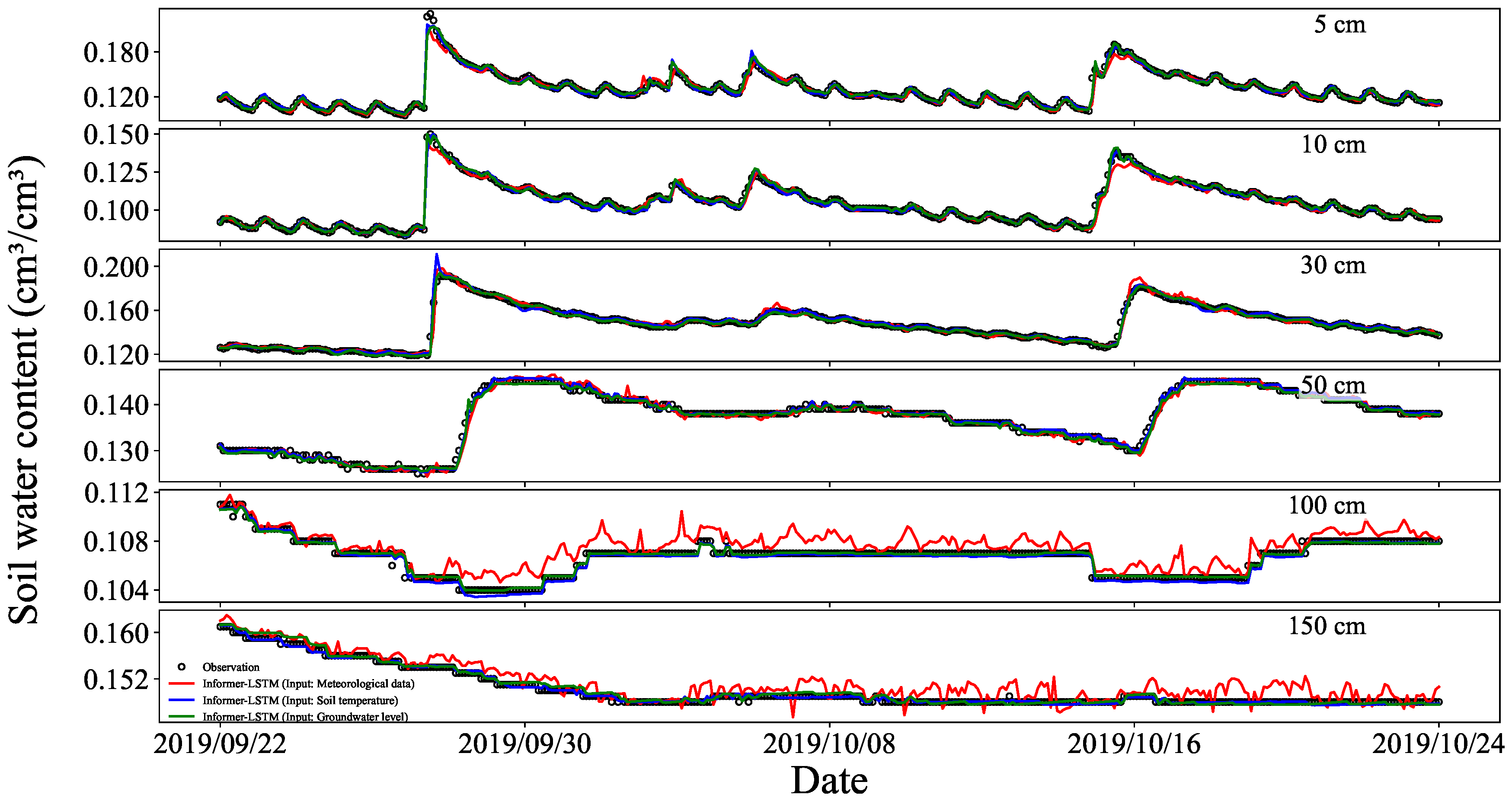 3.2. Simulation of Water Content at Different Soil Depths Using Informer–LSTM