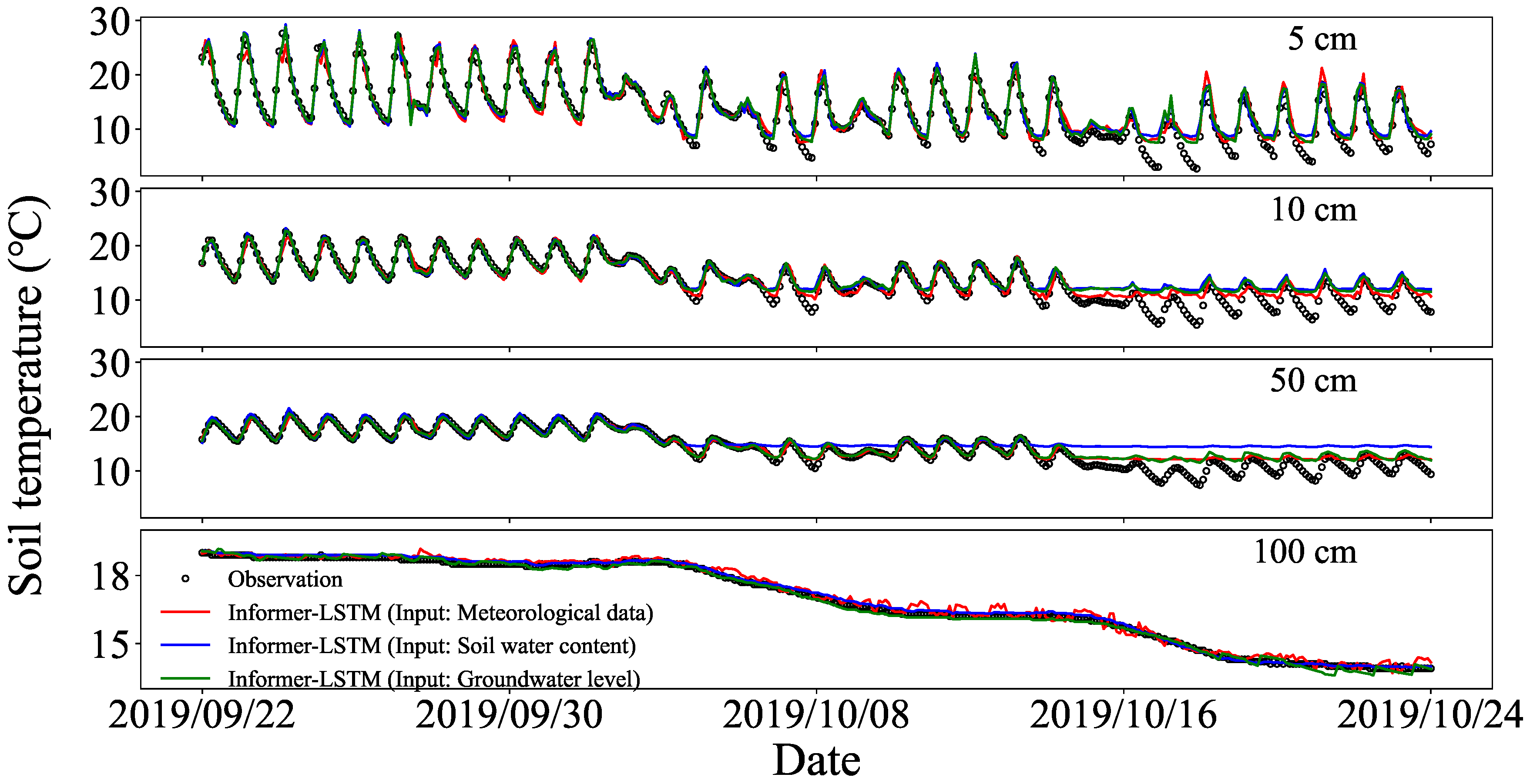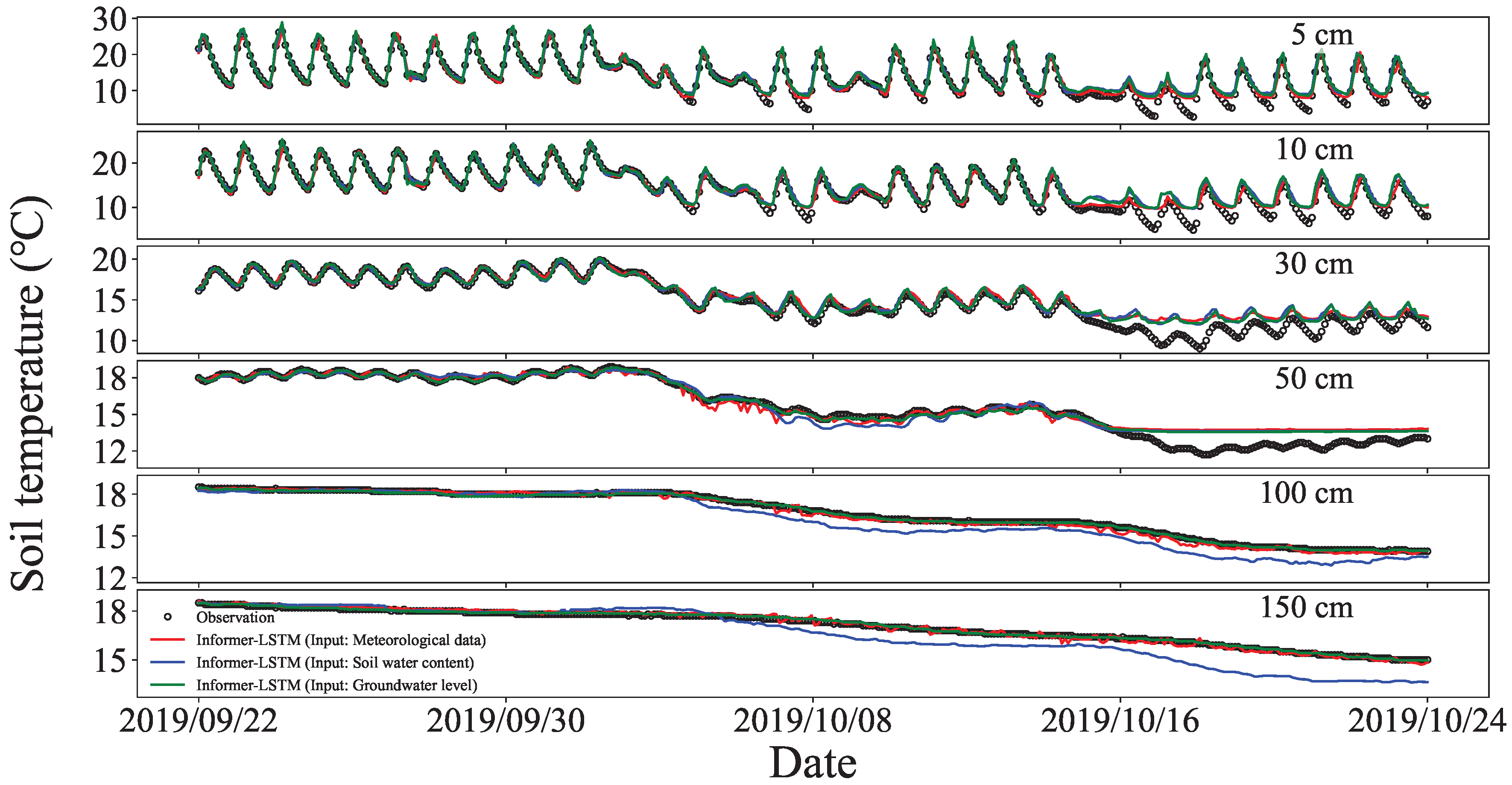 3.3. Simulation of Soil Temperature at Different Depths Using Informer–LSTM
