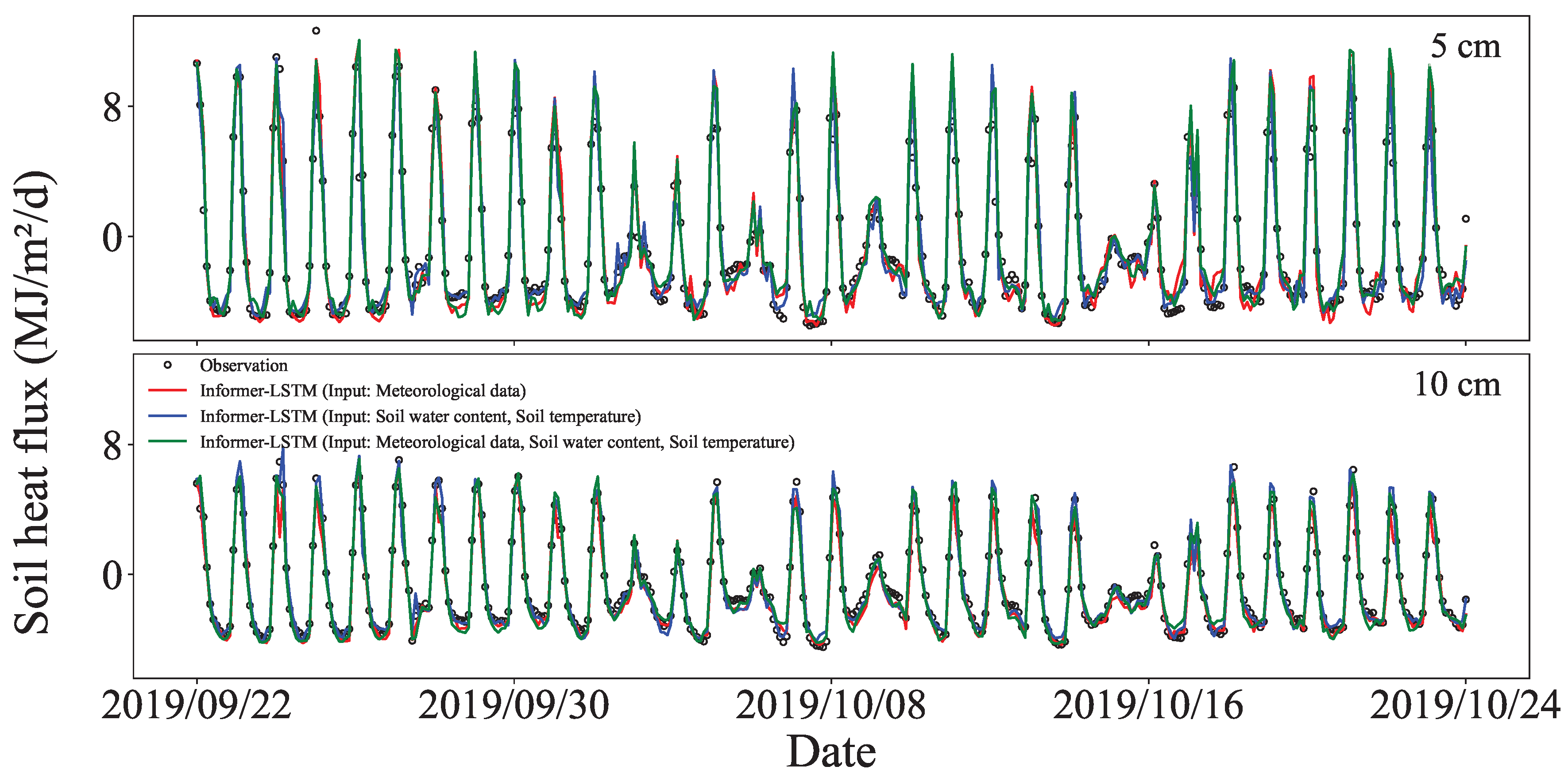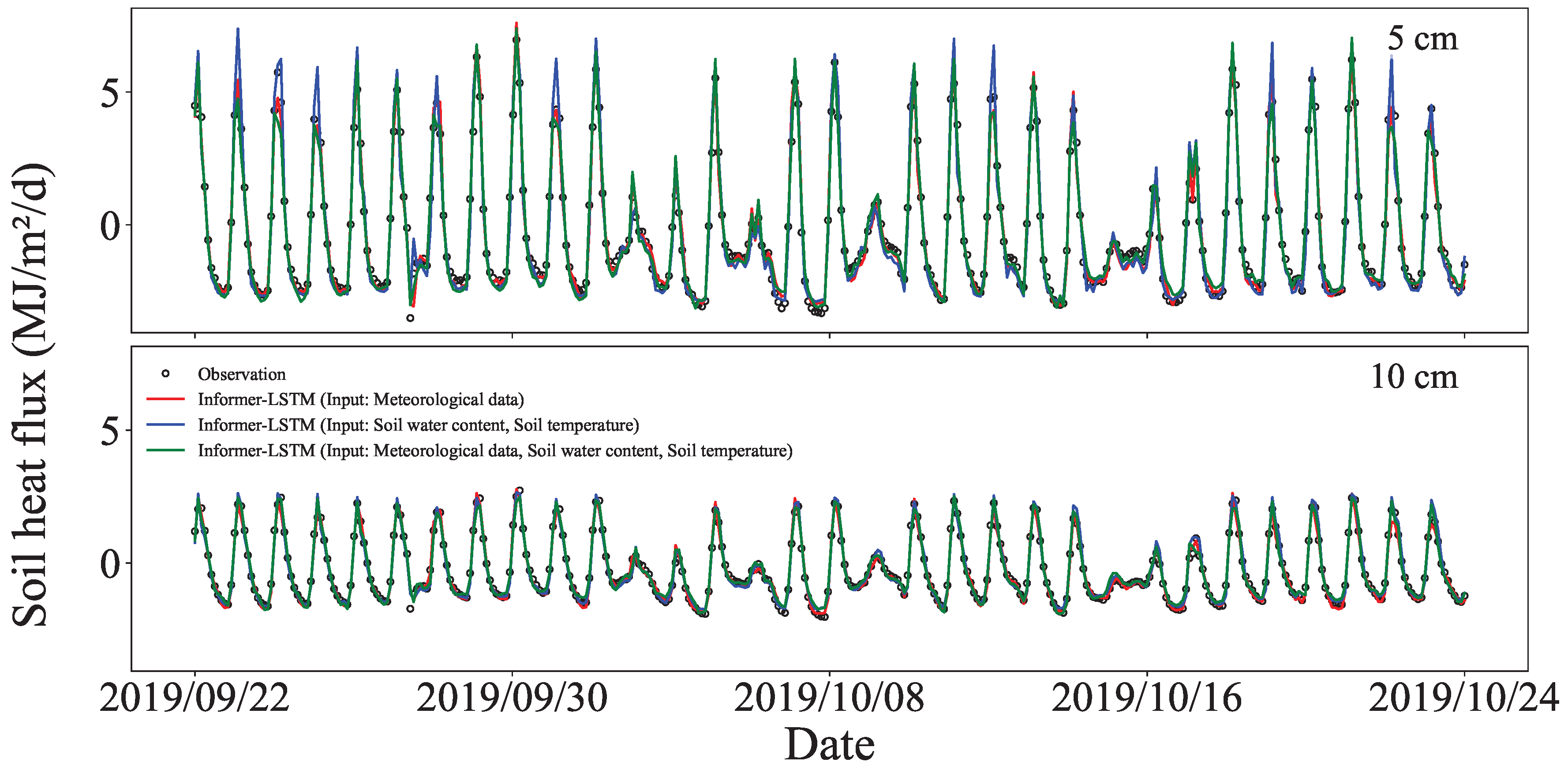 3.4. Simulation of Soil Heat Flux at Different Depths Using Informer–LSTM