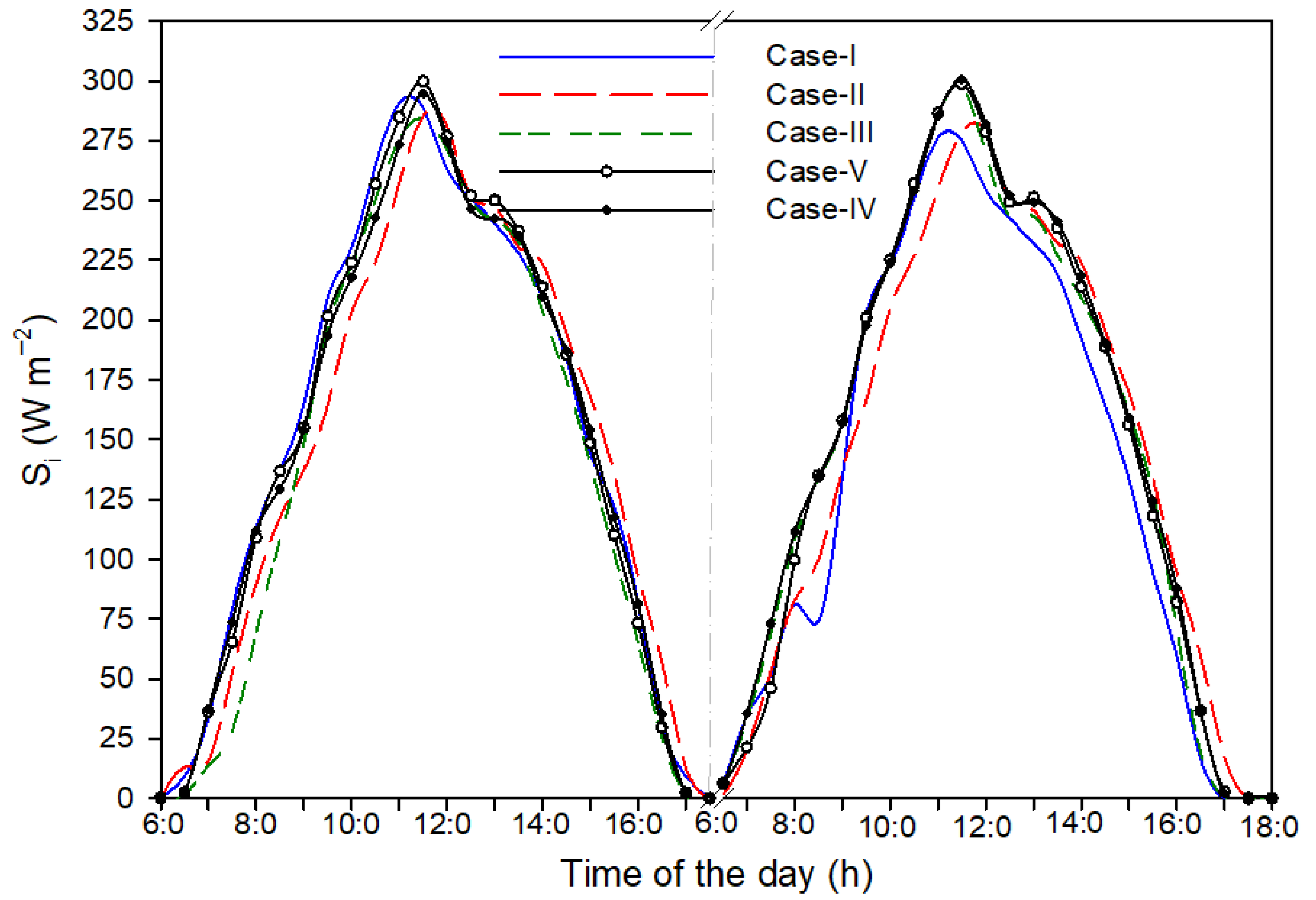 | Si | Solar radiation flux in the greenhouse, W·m−2 |