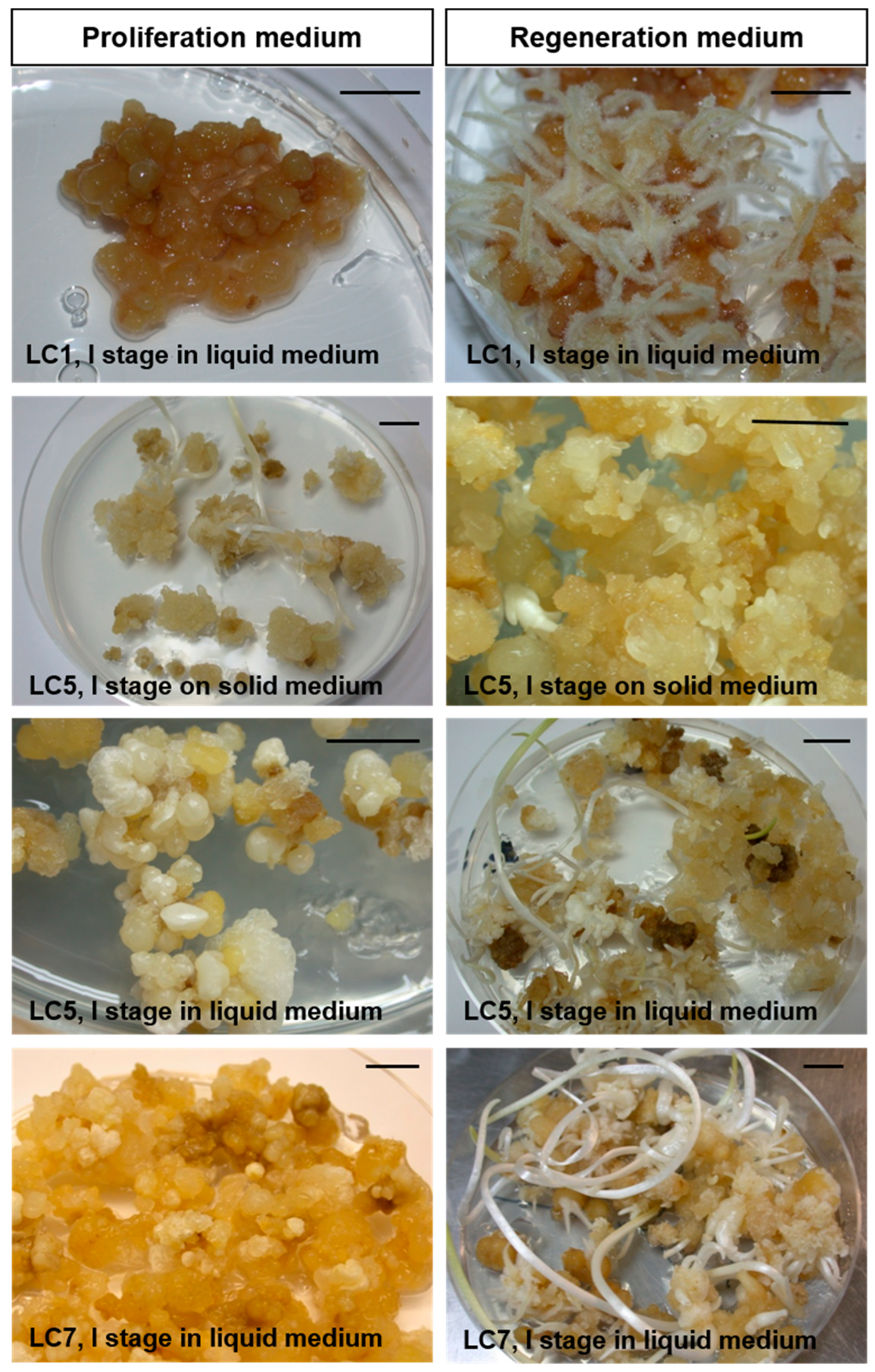 - Nhut, D.T.; Hanh, N.T.M.; Tuan, P.Q.; Nguyet, L.T.M.; Tram, N.T.H.; Chinh, N.C.; Nguyen, N.H.; Vinh, D.N. Liquid culture as a positive condition to induce and enhance quality and quantity of somatic embryogenesis of Lilium longiflorum. Sci. Hortic. 2006, 110, 93–97. [Google Scholar] [CrossRef]