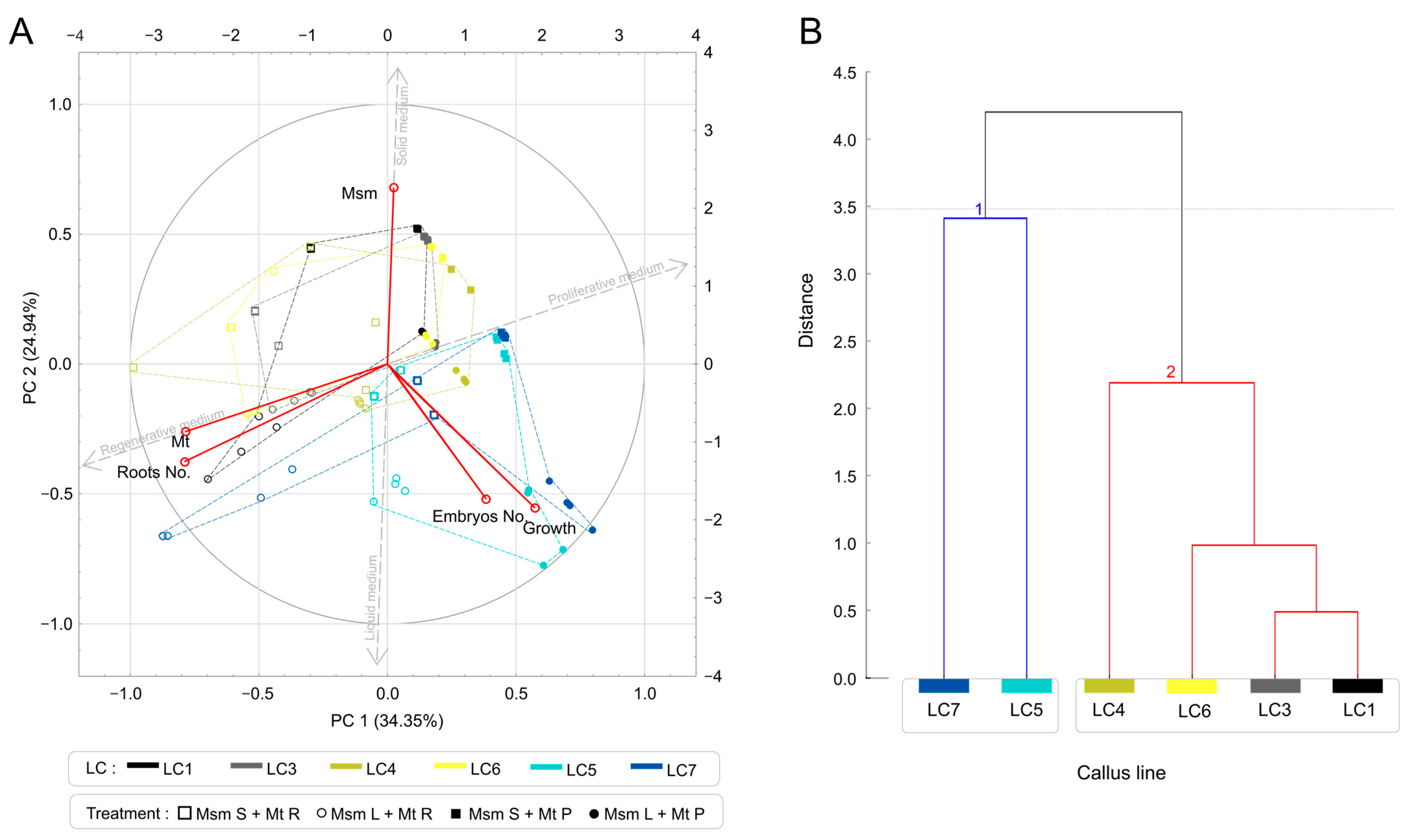 3.3. Effect of Medium Type on LC5 and LC7 Callus Line Parameters