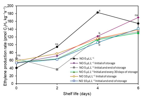 Ethylene production rate in ‘Fuji Mishima’ apples after 8 months of storage in a controlled atmosphere (1.0 kPa O2 + < 0.5 kPa CO2; 1.0 ± 0.2 °C; 94 ± 2% RH), upon chamber opening (Day 0), and after the subsequent 6 days of shelf life (20 ± 1 °C; 65 ± 5% RH), as a function of nitric oxide (NO) application in two doses (5 or 10 µL L−1) and at different times during storage. Treatments followed by the same letter in the same evaluated day do not differ by the Scott–Knott test (p < 0.05). ns: not significant by ANOVA.