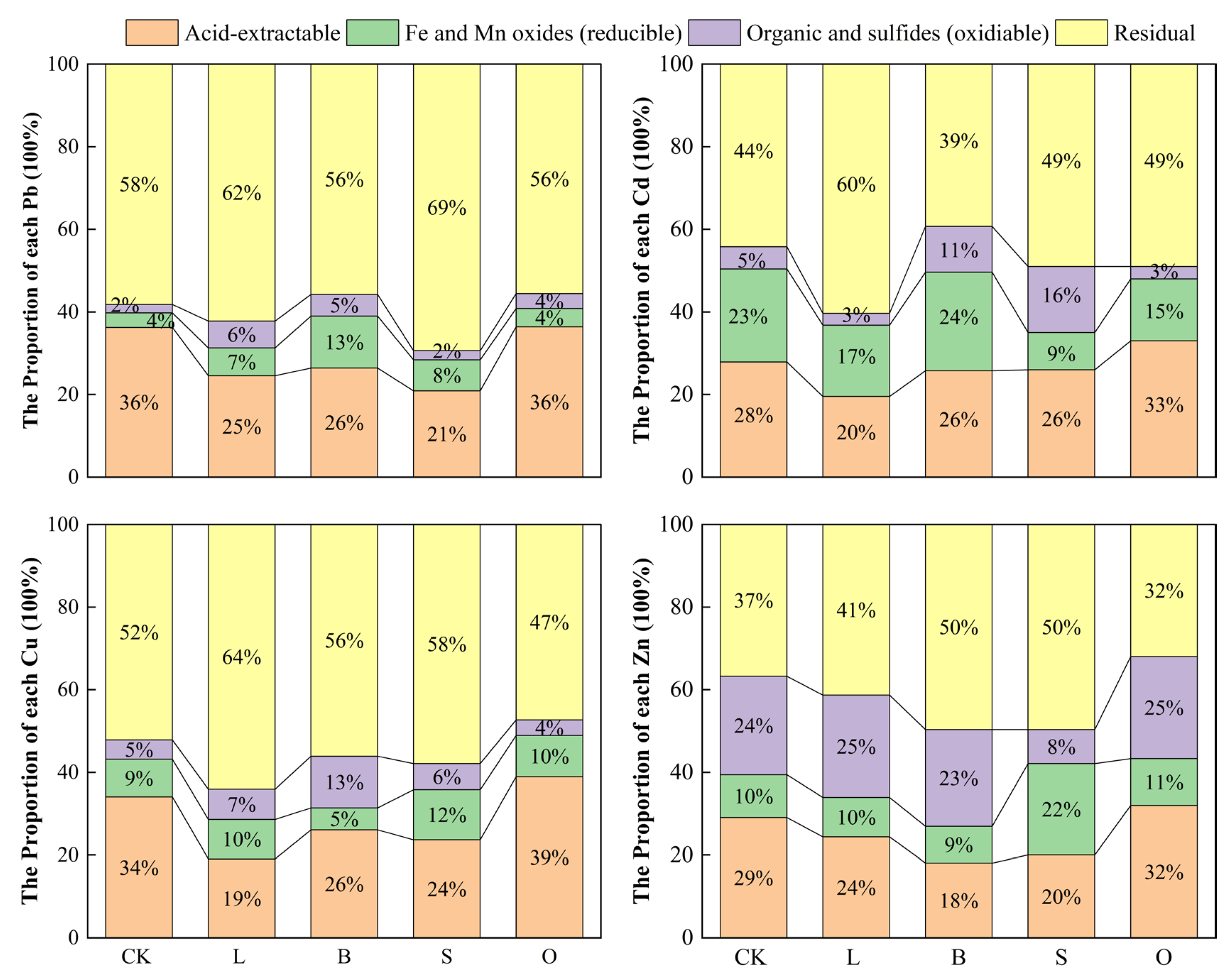 3.3. Effects of the Four Materials on the Chemical Forms of Heavy Metals in Contaminated Farmland Soil