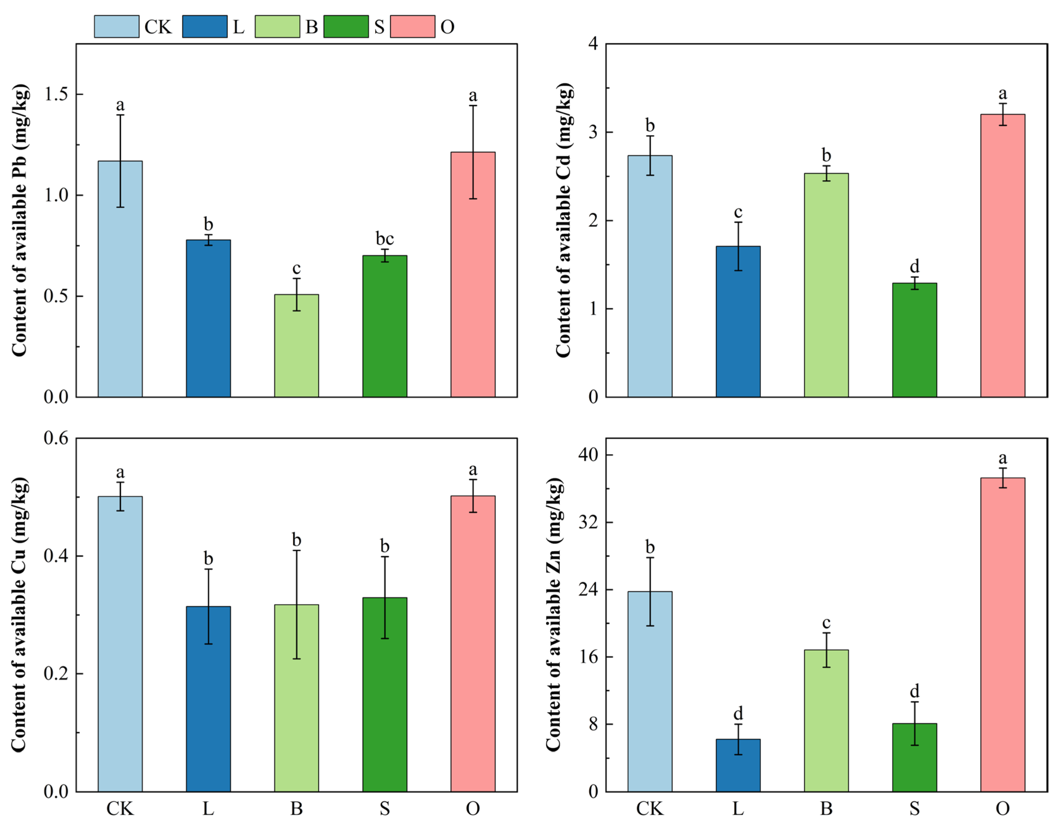 3.4. Effects of the Four Materials on Bioavailable Heavy Metals Content in Contaminated Farmland Soil