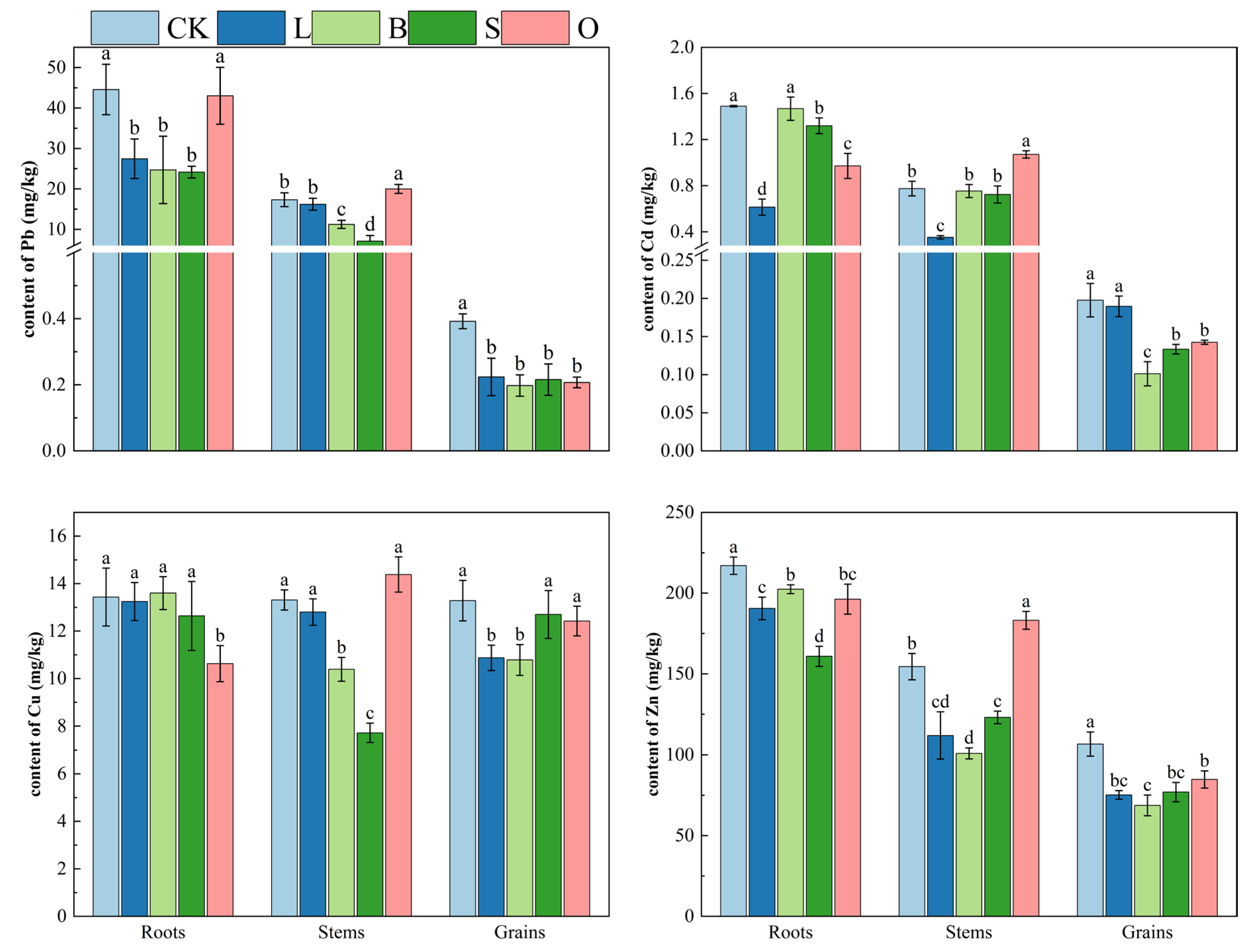 4.1. Effects of the Four Materials on the Bioavailability of Heavy Metals in Contaminated Farmland Soil and the Accumulation of Heavy Metals in Crops