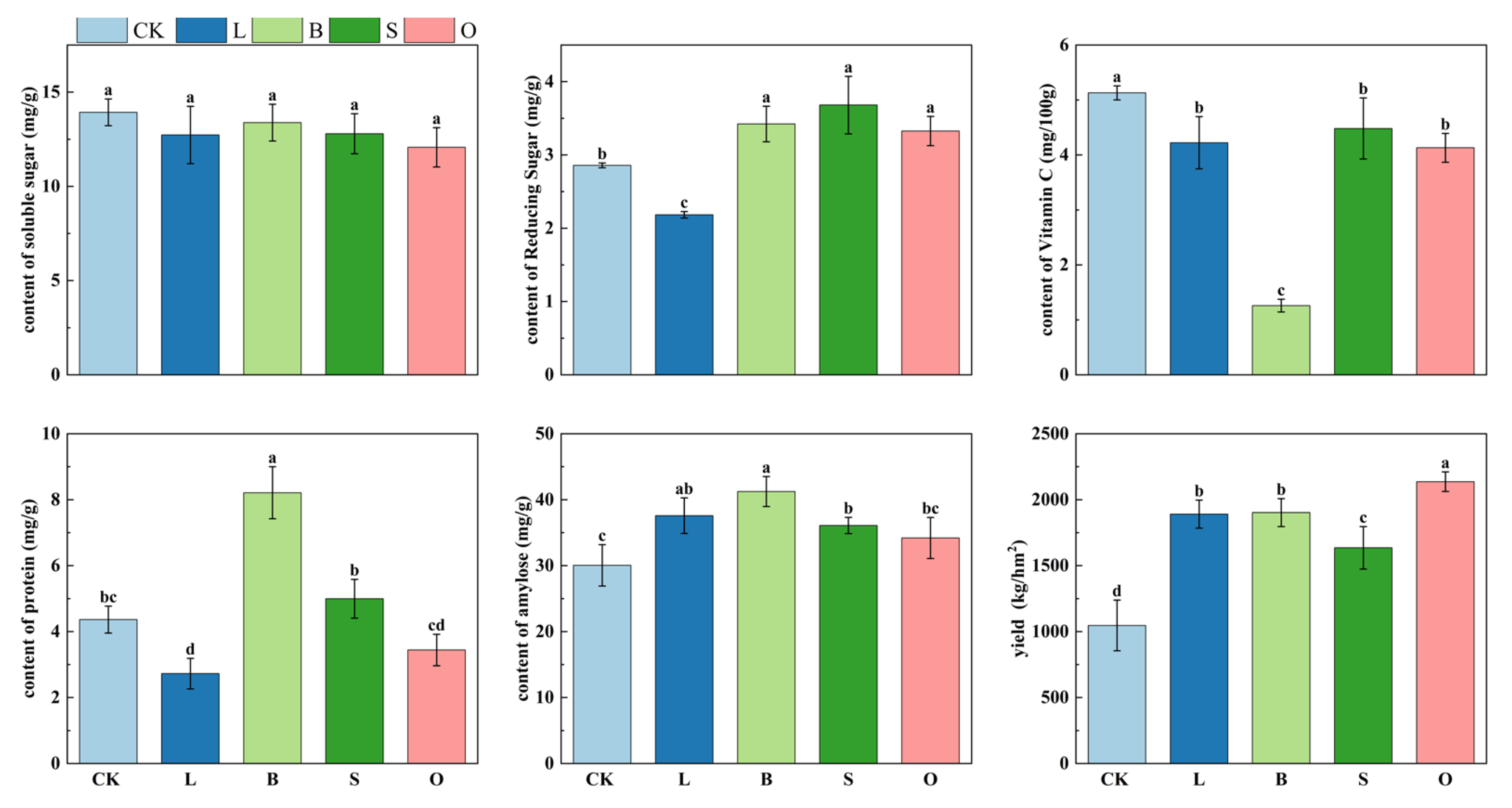 4.3. Effects of the Four Materials on Crop Yield and Quality in Contaminated Soil