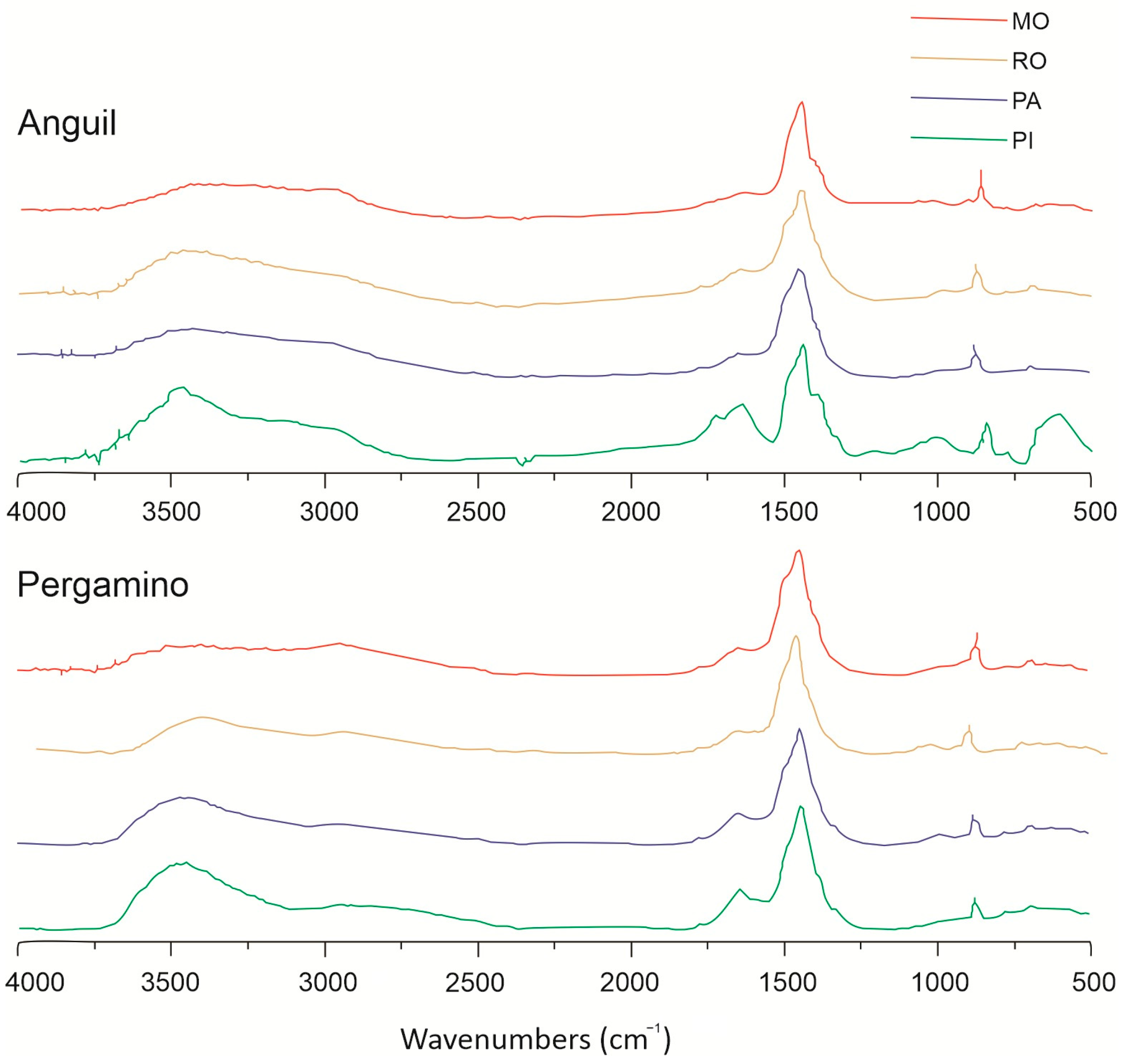| I1450 | Alkane CH2/CH3 | 0.99 ± 0.01 a | 1.00 ± 0.00 a | 0.86 ± 0.05 a | 0.81 ± 0.10 a | 0.89 ± 0.10 a | 1.00 ± 0.00 a | 0.91 ± 0.09 a | 0.99 ± 0.01 a |