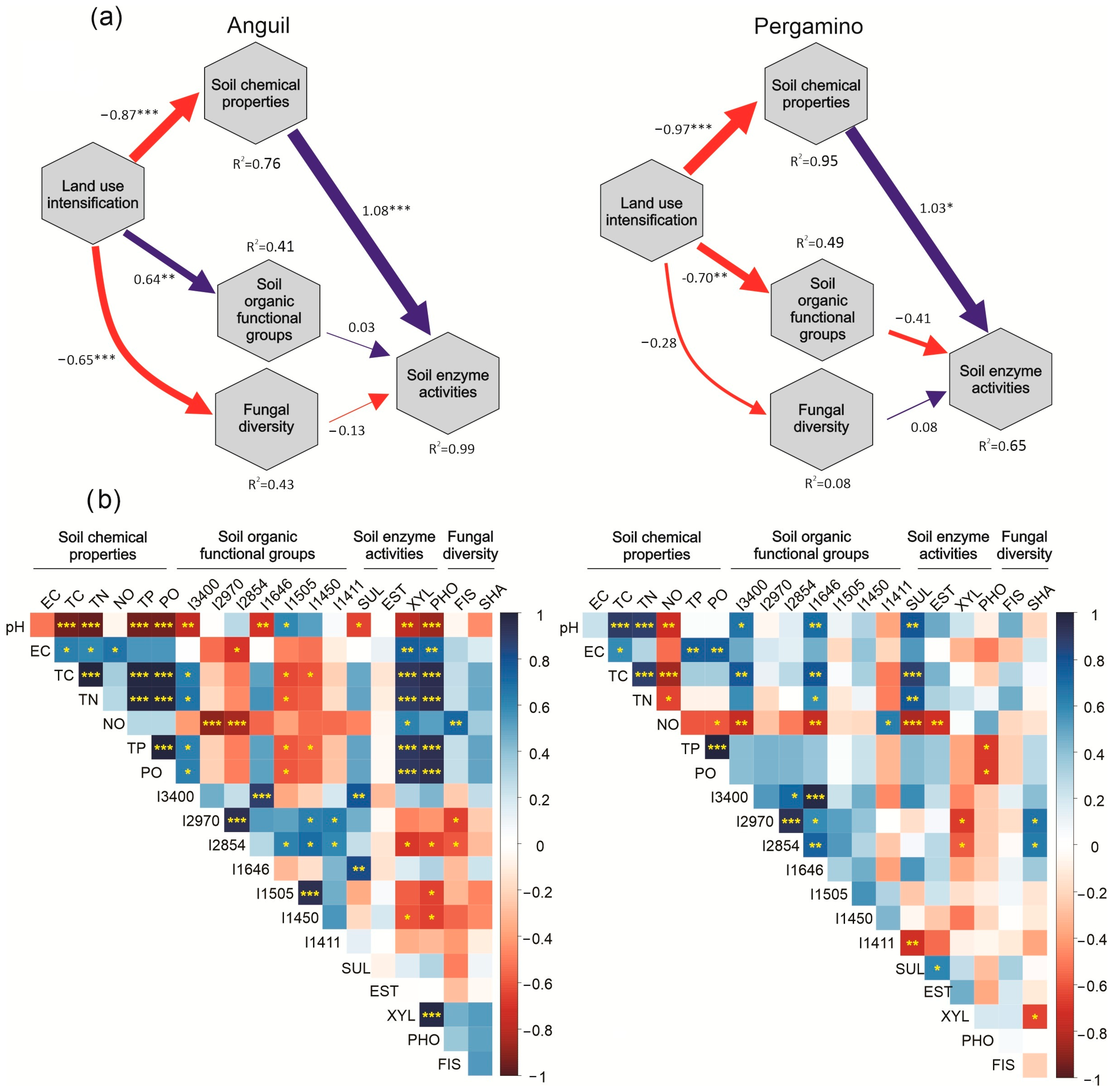 - Barbero, F.M.; Dominchin, M.F.; Verdenelli, R.A.; Frasier, I.; Restovich, S.B.; Campilongo Mancilla, E.J.; Mlewski, E.C.; Labuckas, D.; Vargas Gil, S.; Meriles, J.M. Impact of Land Use Changes on Soil Chemical Properties, Enzyme Activities and Microbial Communities in Two Contrasting Localities of the Argentinian Pampas. Appl. Soil Ecol. 2025, 206, 105836. [Google Scholar] [CrossRef]
