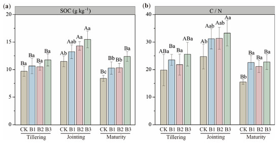 (a) Soil organic carbon (SOC) content and (b) the ratio of SOC to total nitrogen (C/N) in biochar-added soil during the three growth stages. CK: no biochar; B1: 10 t·ha−1 biochar; B2: 20 t·ha−1 biochar; B3: 30 t·ha−1 biochar. Different uppercase letters represent significant differences between the same treatments at different growth stages (p < 0.05), and different lowercase letters represent significant differences between different treatments at the same growth stage (p < 0.05). The error bars are used to represent the SD, n = 3.