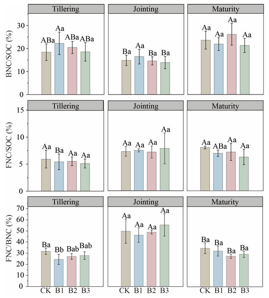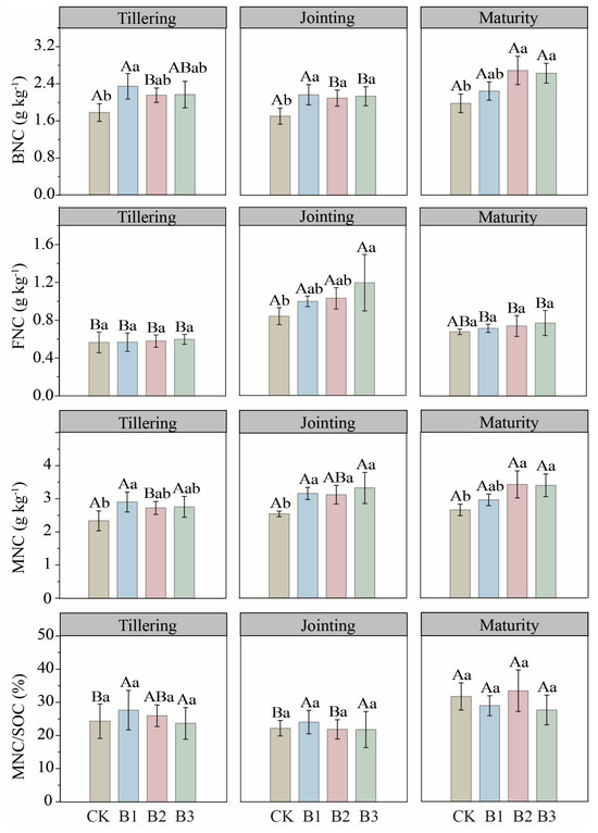 Despite increases in MNC pools, the MNC/SOC ratio did not change significantly with treatment. Ratios of BNC/SOC and FNC/SOC were likewise stable across stages, and BNC remained consistently higher than FNC. Biochar application also did not significantly affect the BNC/SOC ratio. The only notable ratio change was a 22.99% reduction in FNC/BNC under B1 at tillering (p < 0.05); FNC/BNC reached its overall maximum at jointing (Figure 3).