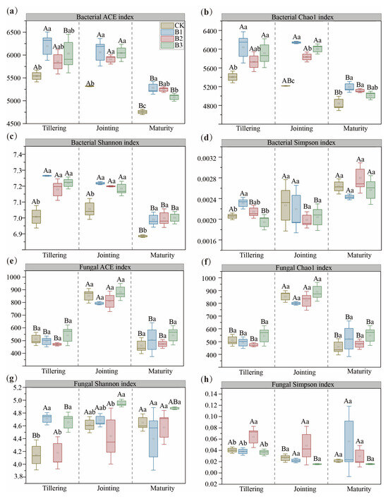 Richness (ACE and Chao 1) and diversity (Shannon and Simpson) indices of bacterial (a–d) and fungal (e–h) species in soil with different biochar treatments across three growth stages. CK: no biochar; B1: 10 t·ha−1 biochar; B2: 20 t·ha−1 biochar; B3: 30 t·ha−1 biochar. Different uppercase letters represent significant differences among growth stages within the same treatment (p < 0.05), and different lowercase letters represent significant differences among treatments within the same growth stage (p < 0.05). The error bars are used to represent the SD, n = 3.