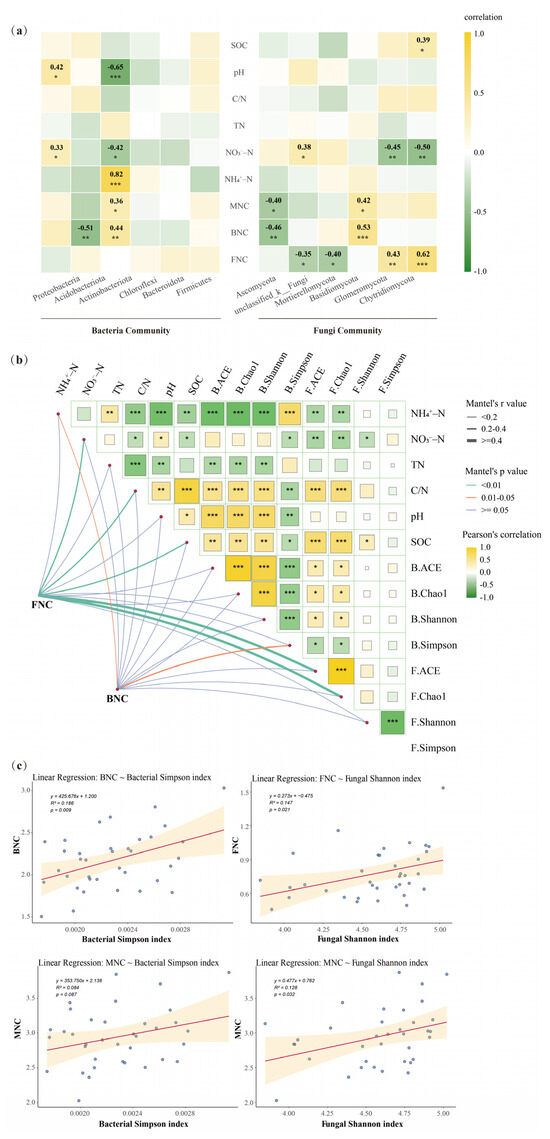 (a) The correlation between microbial community composition (the top six bacteria phylum and the top six fungi phylum by relative abundance) and both soil properties (SOC, pH, C/N, TN, NH4+–N, NO3−–N) and microbial necromass carbon (MNC, BNC, FNC). Color scale indicates correlation coefficients. The star suggested that there was a significant correlation between different parameters (*, ** and *** indicate the significance level at p < 0.05, p < 0.01, and p < 0.001). (b) Correlations between soil properties (SOC, pH, C/N, TN, NH4+–N, NO3−–N) and microbial diversity (B.ACE: Bacterial ACE index; B.Chao1: Bacterial Chao1 index; B.Shannon: Bacterial Shannon index; B.Simpson: Bacterial Simpson index; F.ACE: Fungal ACE index; F.Chao1: Fungal Chao1 index; F.Shannon: Fungal Shannon index; F.Simpson: Fungal Simpson index). Color scale indicates correlation coefficients. The star suggested that there was a significant correlation between different parameters (*, ** and *** indicate the significance level at p < 0.05, p < 0.01, and p < 0.001). Edge width corresponds to Mantel’s correlation coefficient, and edge color reflects Mantel’s significance. (c) Linear regressions between microbial necromass carbon (MNC, BNC, FNC) and microbial diversity indexes. The dots represent the observed data points, and the solid red line denotes the fitted regression line.