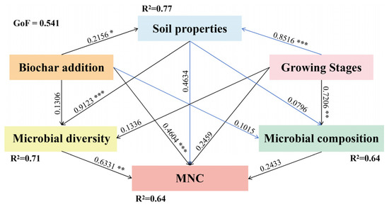 Partial least squares path modeling (PLS–PM) indicated that biochar addition positively influenced soil physicochemical properties (path coefficient = 0.2156, p < 0.05), which in turn had a strong positive impact on microbial diversity (path coefficient = 0.9123, p < 0.001). Microbial diversity subsequently positively influenced MNC accumulation (path coefficient = 0.6331, p < 0.01). A significant direct path from biochar to MNC was also identified (path coefficient = 0.4604, p < 0.001) (Figure 6).