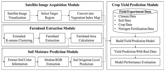 This study aims to more accurately estimate crop yields by extracting farmland using satellite imagery and analyzing the physical characteristics of the soil within the extracted farmland. Figure 1 illustrates the proposed crop yield prediction framework based on satellite imagery and consists of four major modules. First, the Satellite Image Acquisition Module collects satellite images of the target area and converts them into a vegetation index map. The Farmland Extraction Module then applies the K-Means Clustering technique to extract agricultural land from the vegetation index map and calculates the area of the extracted agricultural land. The Soil Moisture Prediction Module extracts soil color information from the extracted agricultural land, converts the median value into a representative RGB value, and uses this value to classify irrigation levels. In this study, the RGB values used in the irrigation level prediction process are considered to reflect soil moisture status. Therefore, the derived RGB values are used to predict soil moisture status, and the predicted soil moisture status is used to predict crop yields in the Crop Yield Prediction Module along with weather, soil, crop, nitrogen fertilization data, and soil physical properties. In this study, an ensemble technique was applied to improve prediction accuracy, and the performance was evaluated by comparing the predicted yield of the developed model with the actual yield.