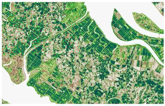 Satellite imagery for the farmland extraction module is collected from Sentinel-2 images provided by ArcGIS online version [20]. Sentinel-2, operated by the European Space Agency (ESA), is a high-resolution Earth observation satellite that provides multispectral images with spatial resolutions ranging from 10 m to 60 m [21]. With 13 spectral bands covering not only the visible spectrum but also the near-infrared (NIR) and shortwave infrared (SWIR) spectrums, Sentinel-2 imagery is highly suitable for analyzing crop vegetation conditions [22]. In this study, the Red, NIR, and SWIR bands are selected because they provide effective information for farmland extraction. Based on these bands, vegetation indices are computed and subsequently transformed into vegetation maps. Table 1 describes the central wavelengths and spatial resolution of the selected three bands. The red band has the shortest central wavelength and belongs to the visible region, whereas the NIR and SWIR band lies within the infrared region. The red and NIR bands, both with a spatial resolution of 10 m, provide precise spatial detail, which is advantageous for farmland extraction. However, the SWIR band has a lower spatial resolution of 20 m, which requires resolution resampling across bands. In this study, the SWIR band was resampled to 10 m resolution using bilinear interpolation, reflecting the continuous variation in vegetation indices [23]. In addition, the solar zenith of the satellite imagery ranged from 30° to 45°, and the solar azimuth ranged from 40° to 90°. To ensure data quality, satellite images with more than 10% overall cloud coverage were excluded before farmland extraction.