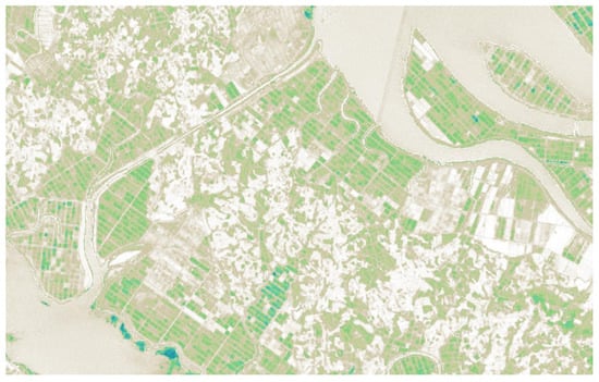 NDMI is a vegetation index that represents the degree of crop water stress on a scale from −1 to 1, and Equation (2) presents its calculation using the NIR and SWIR bands [26]. Figure 3 illustrates the NDMI map of Haenam-gun, Jeollanam-do, South Korea (34.655° N, 126.429° E) generated from satellite imagery. Higher NDMI values indicate healthy vegetation with low water stress, which appear in blue tones, whereas lower values correspond to weakened vegetation with high water stress, appearing in white tones [27]. Thus, NDMI can serve as a valuable indicator for assessing crop water status and vegetation health, making it useful for farmland extraction.
