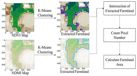 Figure 4 shows the process of extracting farmland using NDVI and NDMI maps. NDVI map highlights vegetated areas in green tones, whereas NDMI map highlights areas with sufficient moisture in blue tones. K-Means Clustering is applied to each image separately, and only the intersection of NDVI and NDMI-based results are selected as the final farmland areas. The extracted farmland is computed on a pixel basis and subsequently converted into actual area units (m2) for further analysis.