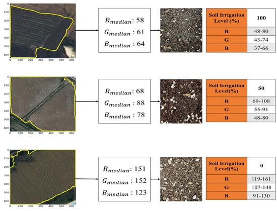 After extracting farmland using NDVI and NDMI maps (see Section 2.1), this study extracts soil color information (RGB), a physical characteristic, by mapping these areas onto satellite imagery from the pre-planting season. Soil color is directly influenced by soil moisture content, which can be used as an indicator of changes in irrigation levels. Irrigation level refers to the degree of moisture supply required for crop growth. For example, a 50% irrigation level supplies half of the crop’s moisture requirement, while a 100% irrigation level supplies the entire amount [29]. Soil moisture content increases gradually with irrigation level, being lowest at 0%, and highest at 100%. Generally, soil appears darker when moisture content is higher, and lighter when moisture content is lower. Therefore, RGB color information, which represents soil color, shows a strong correlation with soil moisture [30]. Soil color differences are particularly pronounced before crop growth begins, making it effective for distinguishing irrigation levels. Therefore, this study utilizes soil RGB values to estimate irrigation levels. Figure 5 shows the process of estimating irrigation levels based on soil color from detected farmland, and divides the irrigation levels of farmland into 100%, 50%, and 0%.