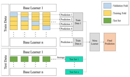 In Figure 6, the entire dataset is divided into training and test data. The training data is then divided into K folds, of which (K − 1) folds are used for model training, and the remaining one is used as a validation fold to evaluate model performance. This process is repeated K times, and since every sample in the training data is included in the validation fold once, predictions for the entire training data can be obtained. Each base learner generates predictions for the training data through this process, and these predictions are combined (stacked) and used as training data for the meta-learner. For the test data, the base learners are trained in each fold individually make predictions, and the average of the resulting predictions is an input as the test data for the meta-learner. This process ensures that all data are utilized in a balanced manner during the training and validation processes, mitigates the over-fitting problem to specific data, and improves model’s generalization performance. Finally, the developed model is applied to actual crop yield data to evaluate its final performance.