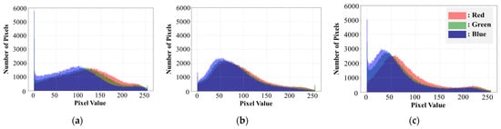 To verify how soil color varies with irrigation levels at the subject area (see Section 3.1), the RGB value distribution of all pixels was analyzed under different irrigation levels. Figure 7 shows the RGB distributions extracted at 0%, 50%, and 100% irrigation levels, which serves as the basis for establishing the reference ranges described in Section 2.2. For the 0% irrigation level, the RGB channel values exhibited a wide distribution (see Figure 7a). Although a large number of pixels with low values were observed in the blue channel, the overall distribution across all three channels appeared relatively normal. However, for the 50% and 100% irrigation levels (see Figure 7b,c), the RGB pixel distribution showed a right skewed pattern. This is because higher irrigation levels increase soil moisture content, which darkens the soil color and causes pixel values to concentrate in the lower range. In particular, at the 100% irrigation level, this became more evident, with nearly 50% of the pixels concentrated in the 0–50 value range. Although the distribution of RGB values varied with each irrigation level, overlapping ranges were observed. For example, the average overlap ratio of RGB values between 0% and 100% irrigation level was approximately 66%. In contrast, the average overlap ratio between 50% and 100% irrigation levels was higher at about 82%. These results indicate that soil moisture content directly influences soil color, and that higher irrigation levels lead to darker soil with lower pixel values.