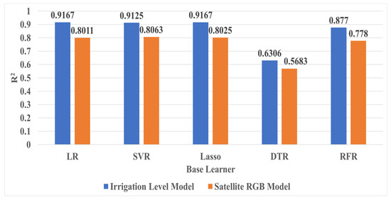 Figure 8 shows the results of comparing the R2 of each base learner in the Irrigation Level Model and Satellite RGB Model. The performance index of each learner was calculated as the average of the values produced through 5-fold cross validation. In the Irrigation Level Model, the base learners with the highest performance were LR and Lasso, both recording R2 of 0.9167. This is approximately 45.4% higher than DTR (0.6306), which showed the lowest R2. In contrast, in the Satellite RGB Model, SVR showed the highest performance with R2 of 0.8063, which is approximately 41.9% higher than DTR (0.5683), which showed the lowest R2. Overall, the base learner of the Irrigation Level Model outperforms the base learner of the Satellite RGB Model. In particular, SVR, which showed the highest R2 in the Satellite RGB Model, was approximately 12.0% lower than LR and Lasso, which showed the highest accuracy in the Irrigation Level Model. However, as can be seen in the results in Table 7, the Satellite RGB Model showed higher performance when the metamodel was applied, even though the base learner’s performance was lower than that of the Irrigation Level Model. This shows that the stacking ensemble technique effectively complements the limitations of individual base learners, and is particularly suitable for the Satellite RGB Model.
