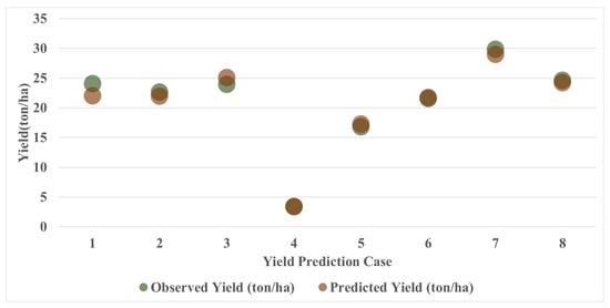 Figure 9 compares the actual and predicted yields when SVR was used as a meta-learning tool in the Satellite RGB Model, which showed the highest prediction accuracy, as shown in Table 7. Note that there are eight test datasets (or test datasets from eight folds) used for the model evaluation in Figure 9 (see Section 2.3). Overall, the actual and predicted yields showed similar trends. Despite the different distributions of actual yields across cases, the model reflected this variability well and reliably predicted yields at various levels. In particular, Case 4 predicted yields most accurately, with a prediction error of approximately 0.02 ton/ha. Conversely, Case 1 showed the largest discrepancy between the predicted and actual yields.