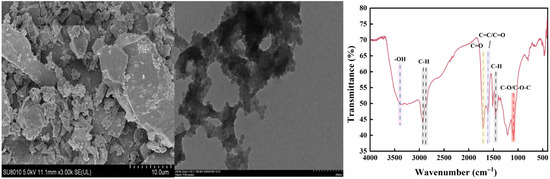 The AHA raw material was sourced from mature corn stalks collected within the campus of Northeast Agricultural University. After collection, the stalks were first washed, then dried in a constant-temperature oven at 105 °C, followed by pulverization. Liquid artificial humic acid was prepared via hydrothermal humification technology [16]. Solid humic acid was obtained using 6 mol/L hydrochloric acid through precipitation and centrifugation. This solid was dissolved in a 3% ammonia solution (Shanghai Hushi Laboratory Equipment Co., Ltd., Shanghai, China), adjusted to neutral pH, and ultimately yielded a 1 g/L concentration of liquid AHA. The C/N ratio, determined using an elemental analyzer (Olivetti, Ivrea, Italy), was approximately 10.9:1. Scanning electron microscopy (SEM) (Hitachi Ltd., Tokyo, Japan), transmission electron microscopy (TEM) (Hitachi Ltd., Tokyo, Japan) images and Fourier transform infrared spectroscopy (FTIR) (Thermo Fisher Scientific Inc., Waltham, MA, USA) analyses of the synthetic humic substance are presented in Figure 1.