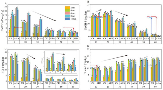 Comparative analysis of the effects of the two AHA application depths on Olsen-P, NaHCO3-P, NaOH-P, and HCl-P concentrations revealed that AHA application at 10–20 cm significantly enhanced soil P effectiveness. Compared with AHA application at 30–40 cm, AHA application at 10–20 cm is more effective in promoting the transformation of P into other forms. From the perspective of the whole soil column, the Olsen-P concentration tended to increase with prolonged incubation time, while NaHCO3-P, NaOH-P, and HCl-P concentrations generally exhibited a decreasing trend. Specifically, AHA application at 10–20 cm resulted in a higher Olsen-P concentration compared to application at 30–40 cm. On day 60 of incubation, the Olsen-P concentration of the addition of AHA at 10–20 cm was 7.83% higher than that of the other treatment. The NaOH-P concentration exhibited a similar trend, with higher concentrations observed at depths of 10–20 cm, representing a 6.12% increase compared to other treatments.