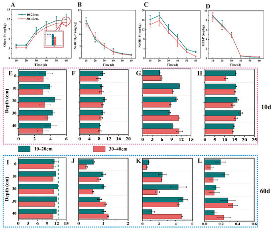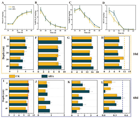 Concentration changes in Olsen-P (A), NaHCO3-P (B), NaOH-P (C), and HCl-P (D) during the soil incubation cycle under conditions of AHA addition at 10–20 cm depth and AHA addition at 30–40 cm depth, and concentration changes in Olsen-P (E,I), NaHCO3-P (F,J), NaOH-P (G,K), and HCl-P (H,L) at different depths in the soil profile. (The bar graphs represent the average values of different P components under each treatment, and the lines above the bars indicate the standard error. The green dashed line indicates the Olsen-P content at 10 cm soil depth when applying AHA at 10–20 cm intervals. The blue and red dashed lines represent the soil Olsen-P content on day 60 under the conditions of AHA addition at the 10–20 cm and 30–40 cm. These dashed lines are designated to serve as a visual aid for the direct comparison of P levels.)
