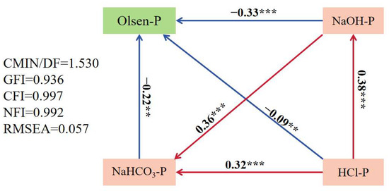 Structural equation model of Olsen-P, NaHCO3-P, NaOH-P, and HCl-P transformations. Numbers next to the arrows indicate standardized path coefficients and asterisks mark their significance: *** p < 0.001, ** p < 0.01. (CMIN/DF: Chi-square Minimum/Degrees of Freedom; GFI: Goodness-of-Fit Index; CFI: Comparative Fit Index; NFI: Normed Fit Index; RMSEA: Root Mean Square Error of Approximation. Positive and negative path coefficients are represented by red and blue lines with arrows.)