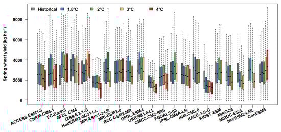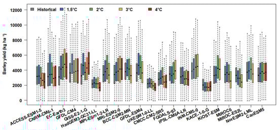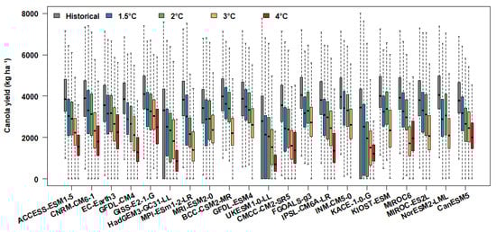 Figure 2, Figure 3 and Figure 4 summarize results for the DSSAT modelling of spring wheat, barley and canola across the prairie agricultural zone (468 CSDs). The boxplots illustrate distinct shifts in yield distributions across warming levels and GCMs. Spring wheat shows mixed responses so that several models (e.g., ACCESS-ESM1-5, EC-Earth3, MPI-ESM1-2-LR) maintain yields at 1.5 °C of warming, while more substantial declines emerge beyond 2 °C, particularly under HadGEM3-GC31-LL and IPSL-CM6A-LR. Canola yields exhibit the steepest and most consistent reductions, with most GCMs projecting substantial downward shifts, especially at 3 °C and 4 °C of GW. By contrast, barley demonstrates relatively greater resilience, with several models (e.g., GFDL-ESM4, BCC-CSM2-MR, NorESM2-LMM) indicating modest increases or stable yields even under moderate to high levels of warming. However, interquartile ranges widen with warming across all crops, suggesting increased variability and uncertainty in yield outcomes.