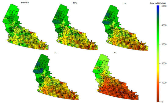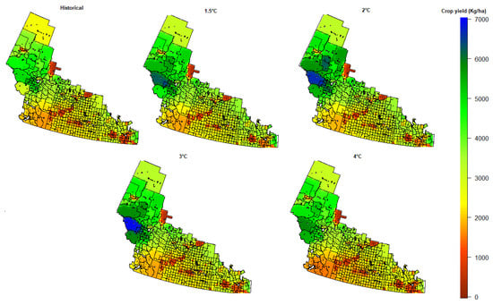 The geographic distribution of median projected wheat yield in the prairie agricultural zone for historical and global warming levels.
