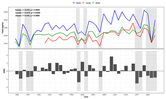 Temporal changes in annual wheat, barley and canola yield and growing season SPEI during 1984–2022. The correlation coefficient (r) and statistical significance (p-value) are given.