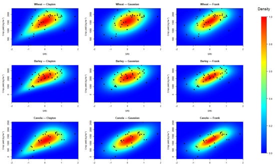 We assessed the performance of Clayton, Gaussian, and Frank copulas in modeling the joint distribution between SPEI and crop yields for wheat, barley, and canola (Table 6). For wheat, the Frank copula exhibited the best fit, with the lowest S statistic (0.002) and highest p-value (0.950), indicating excellent agreement with the empirical dependence structure. Similarly, Clayton performed best for barley (S = 0.013, p = 0.878), while for canola, the Frank copula again outperformed the others (S = 0.001, p = 0.970), suggesting consistent lower-tail dependence between drought severity and yield reduction in these crops. Although the Gaussian copula showed a comparatively weaker fit across all crops (with p-values below 0.45), all models produced statistically acceptable fits (p > 0.16), supporting the use of copula-based methods for probabilistic yield modeling.