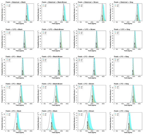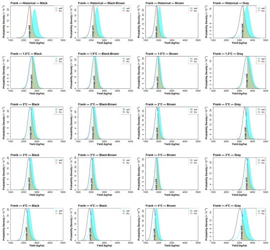 Conditional probability distributions of Frank detrended canola yields under dry (orange) and wet (cyan) conditions across soil zones (Black, Black–Brown, Brown, and Gray) during historical and global warming levels. The greenish areas correspond to dry conditions, but their color appears altered due to the overlay and transparency effects between the two distribu-tions.4. Discussion.