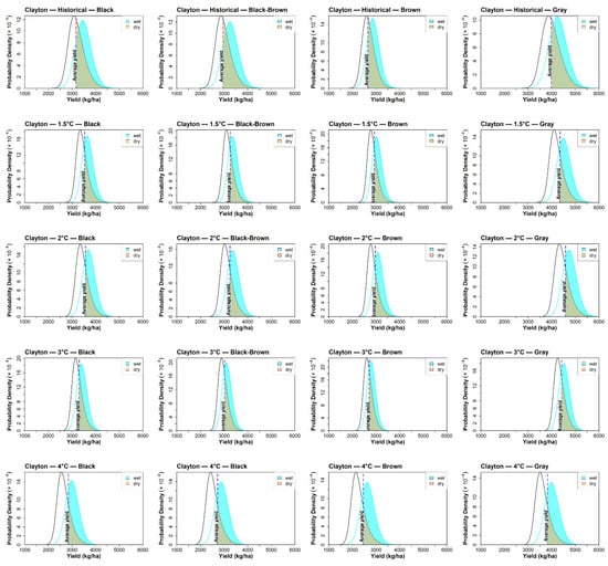 Conditional probability distributions of Clayton detrended barley yields under dry (orange) and wet (cyan) conditions across soil zones (Black, Black–Brown, Brown, and Gray) during historical and global warming levels. The greenish areas correspond to dry conditions, but their color appears altered due to the overlay and transparency effects between the two distributions.