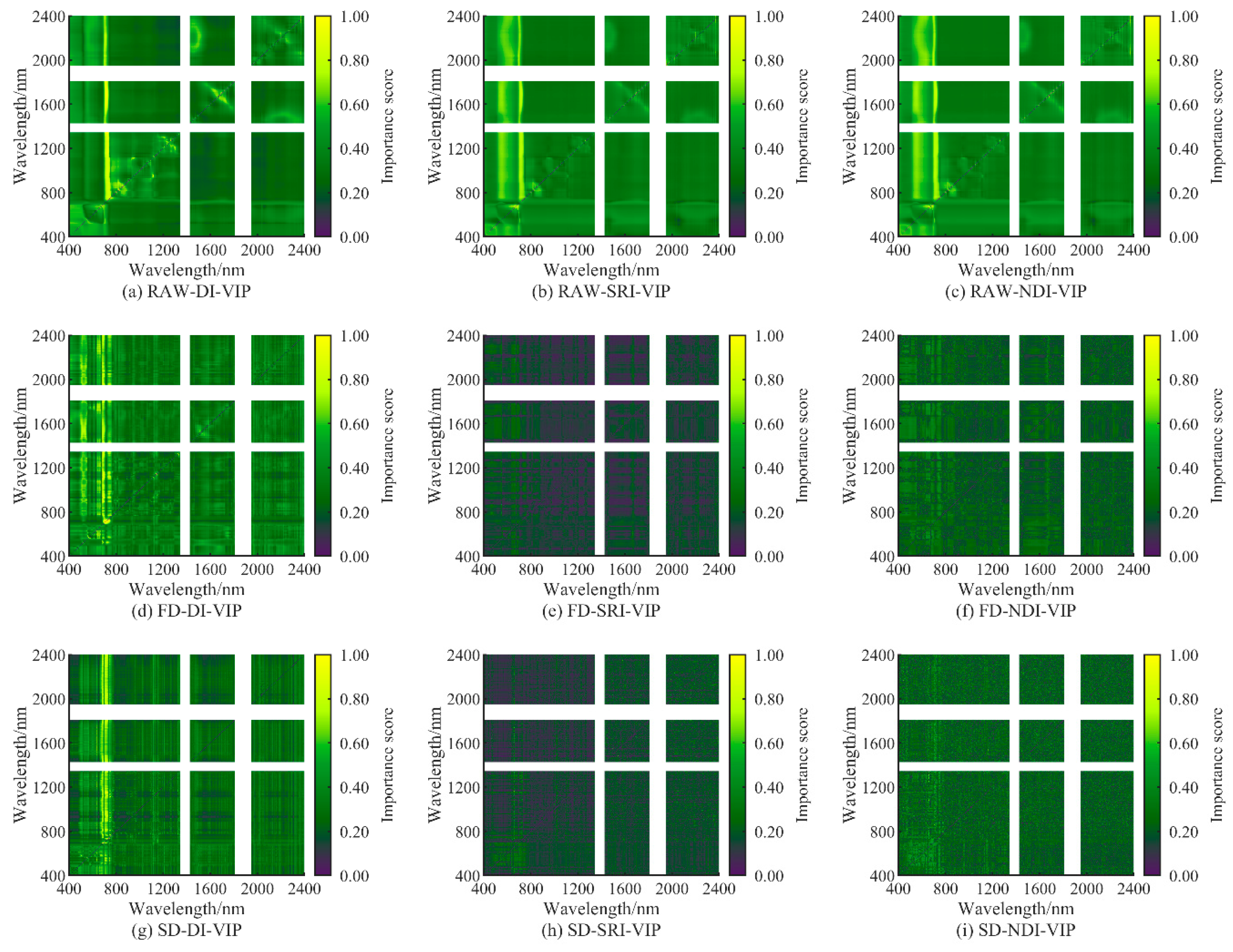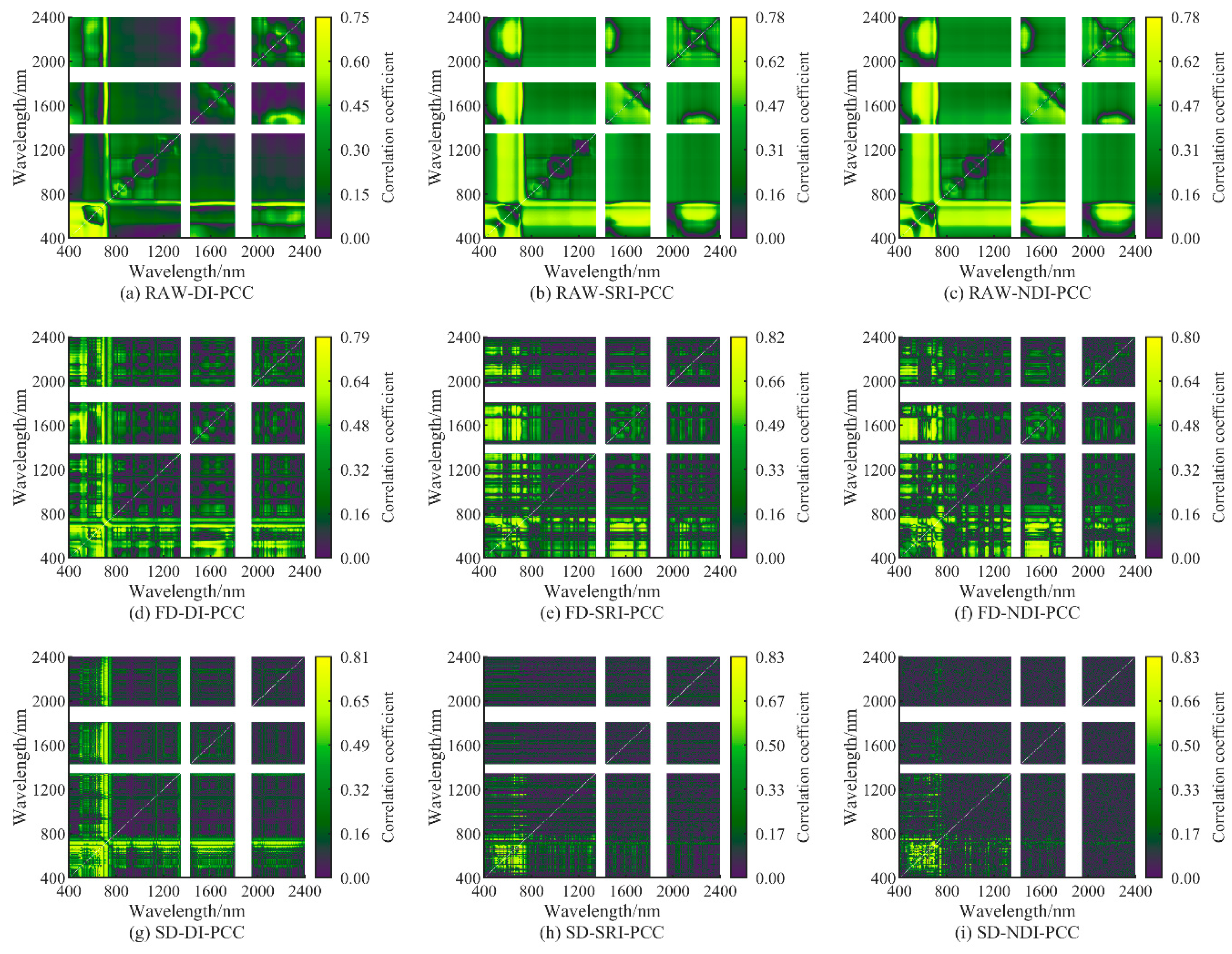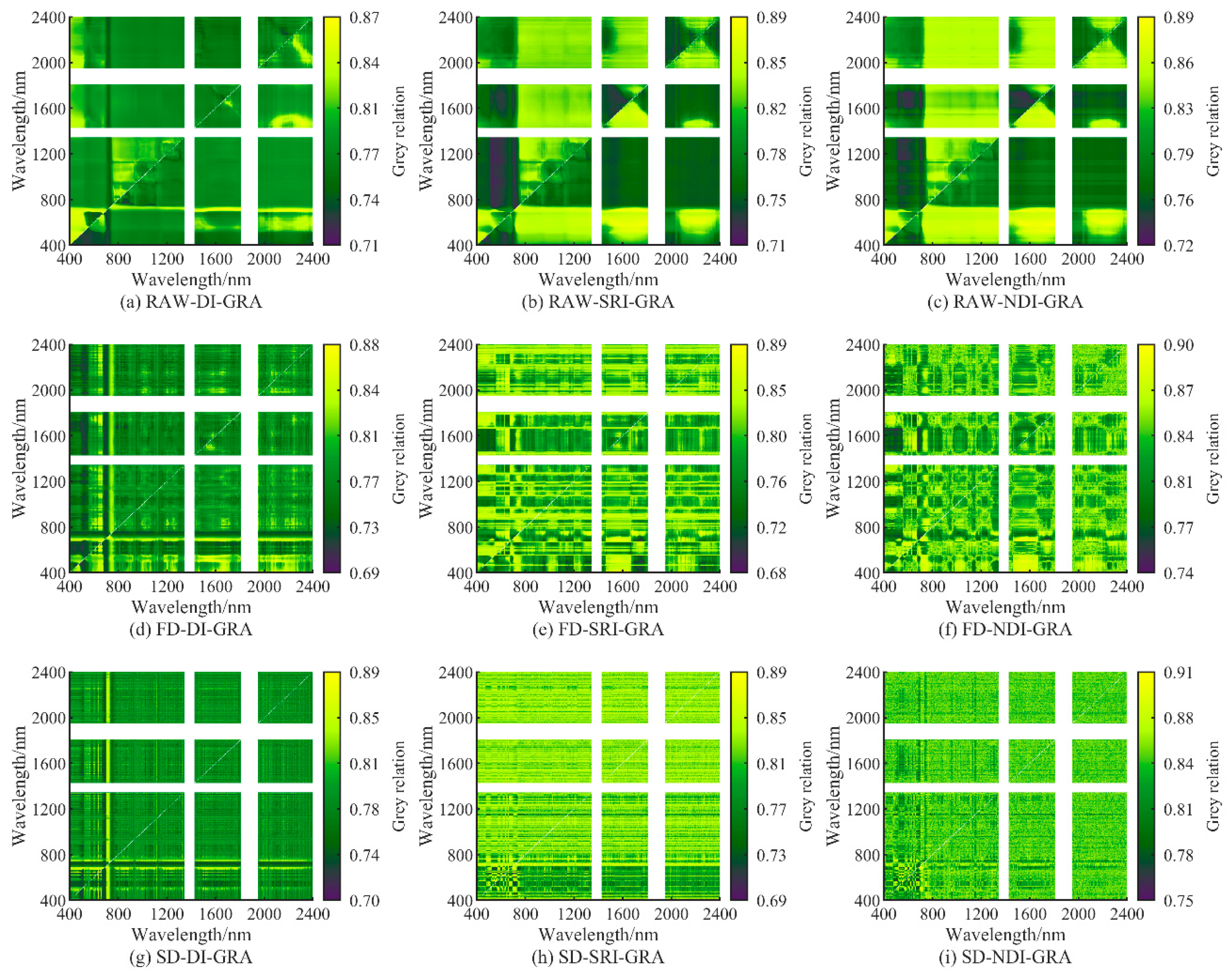 | Feature Selection Strategies | Processing Method | DI Optimal Wavelength Position (i, j)/nm | Max(ξ/r/Score) | SRI Optimal Wavelength Position (i, j)/nm | Max(ξ/r/Score) | NDI Optimal Wavelength Position (i, j)/nm | Max(ξ/r/Score) |