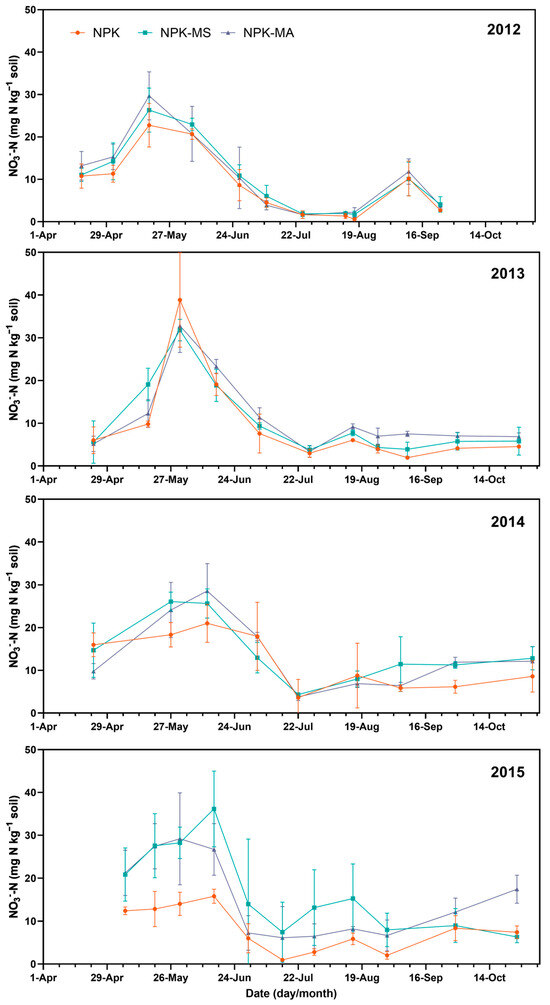 - Thomsen, I.K. Crop N utilization and leaching losses as affected by time and method of application of farmyard manure. Eur. J. Agron. 2005, 22, 1–9. [Google Scholar] [CrossRef]