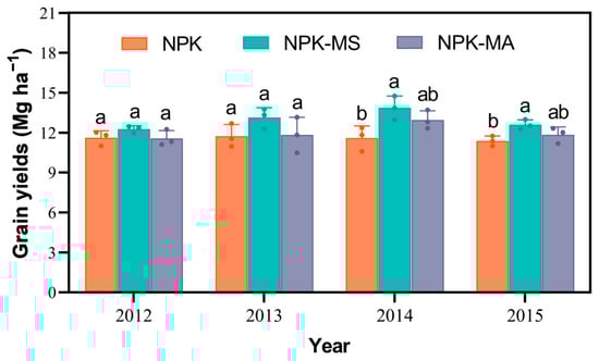 3.2. Maize Grain Yields and Aboveground Biomasses